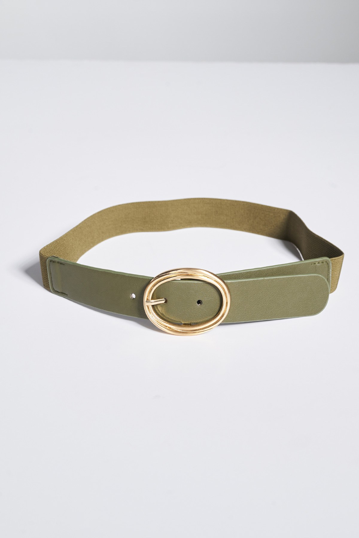 Ελαστική ζώνη με τελείωμα δερματίνης και αγκράφα σε χρυσή απόχρωση.