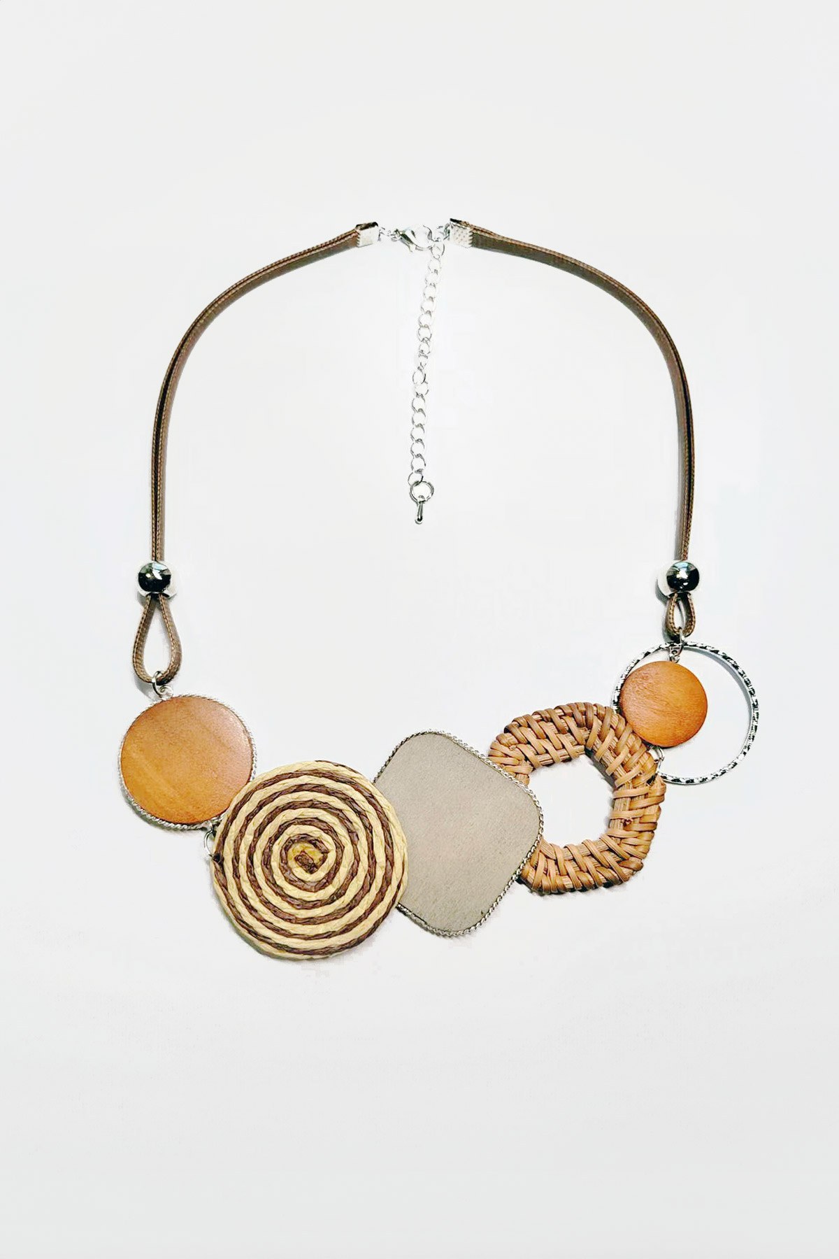 Κολιέ με πλακέ κορδόνι. Με μεταλλικά κινούμενα και πλακέ στοιχεία διαφορετικών υφών και σχημάτων. Μεταλλικές μπίλιες κρατούν τα διακοσμητικά στοιχεία σταθερά. Κούμπωμα στο λαιμό με γάντζο. Μήκος 20,3 εκ. με επέκταση 7.5 εκ.