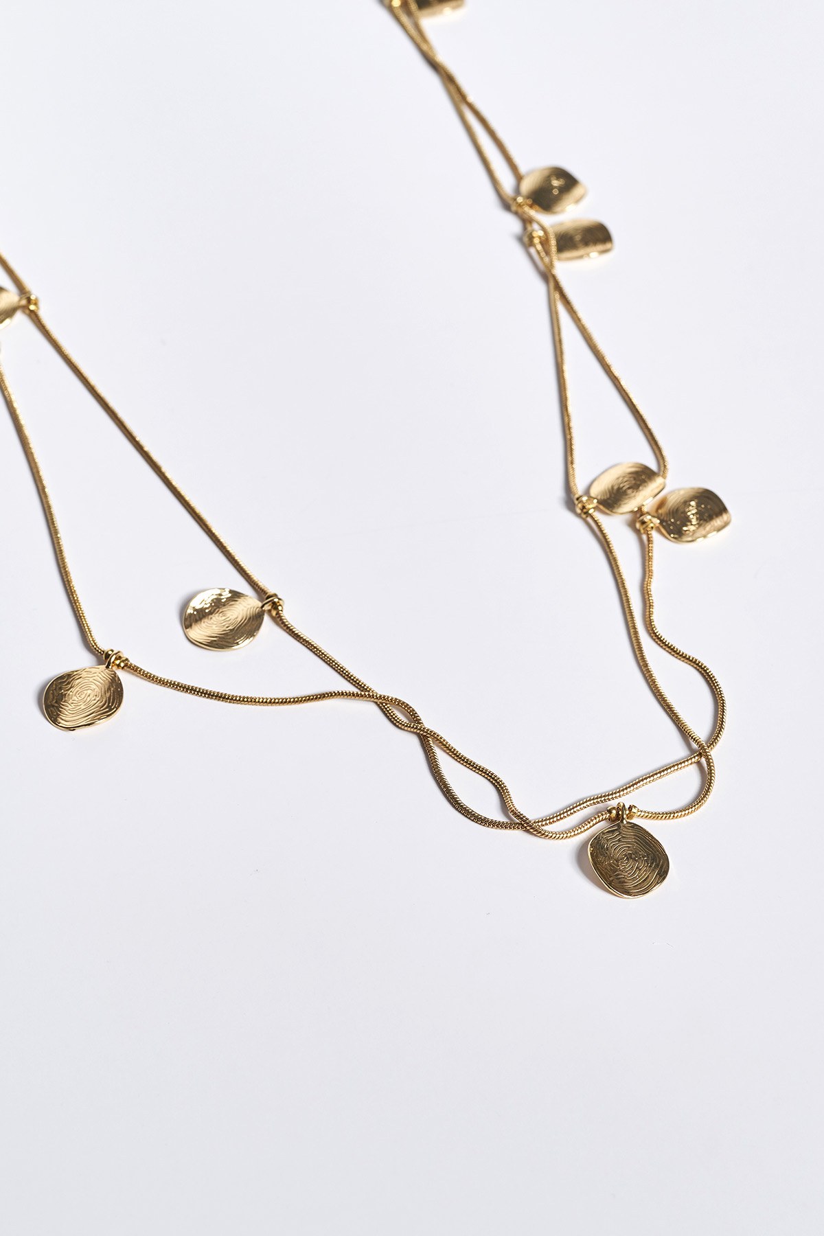 Χαρίστε μια αίσθηση διακριτικής πολυτέλειας και κίνησης σε κάθε σας βήμα με αυτό το εντυπωσιακό κόσμημα. Πρόκειται για ένα μακρύ κολιέ με διπλή λεπτή αλυσίδα που κοσμείται από ανάγλυφα στοιχεία σε σχήμα φλουριού και διαθέτει κούμπωμα τύπου παπαγαλάκι με έξτρα αλυσίδα αυξομείωσης. Είναι ιδανικό για να φορεθεί πάνω από μονόχρωμα ζιβάγκο ή basic t-shirts, προσθέτοντας λάμψη στις casual chic εμφανίσεις σας.