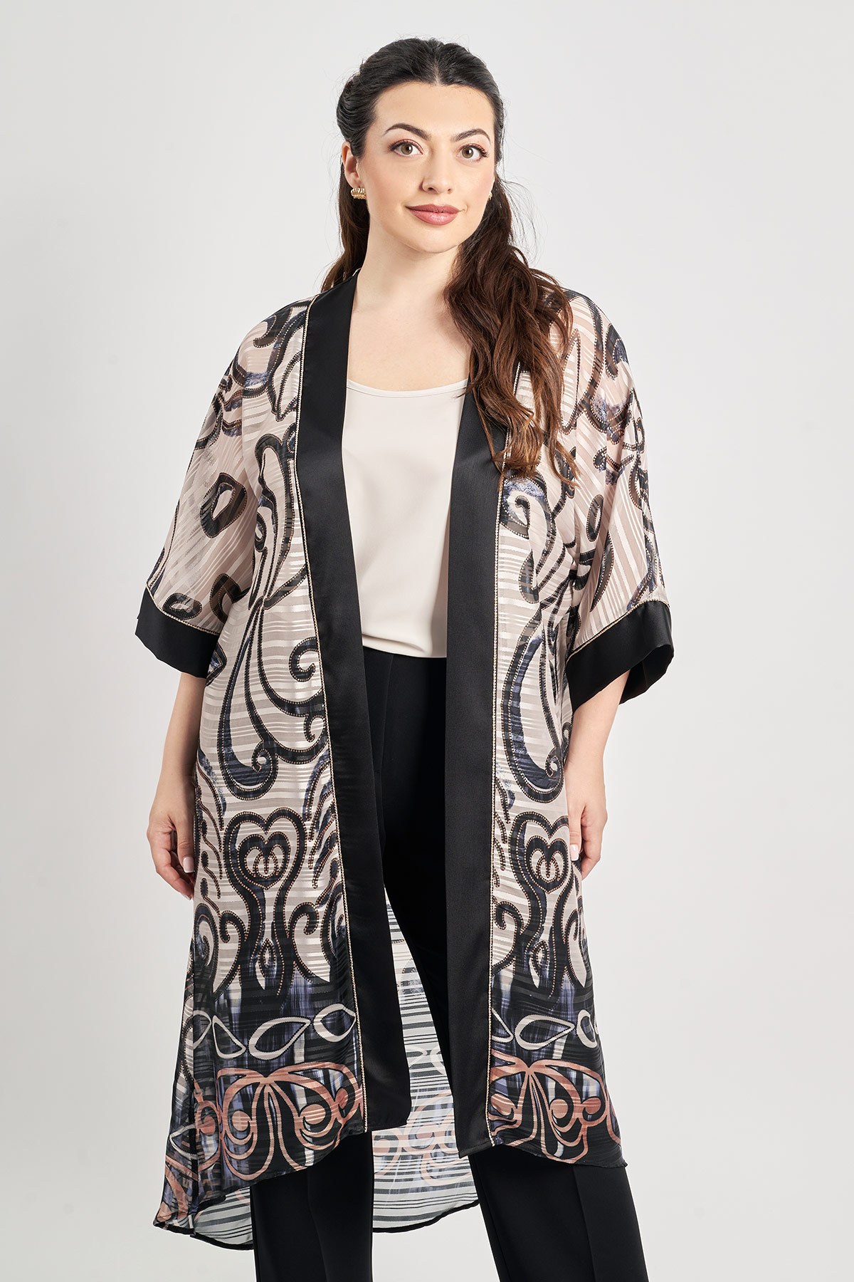 Αιθέριο μίντι κιμονό από ημιδιάφανο σιφόν σε εμπριμέ με μοτίβο λαχούρια. Χωρίς κούμπωμα. Φάσα σατινέ στο πέτο και στα μανίκια. Μανίκια 3/4. Το μοντέλο έχει ύψος 172 εκ, στήθος 108, μέση 94, περιφέρεια 111 και φοράει το μέγεθος S