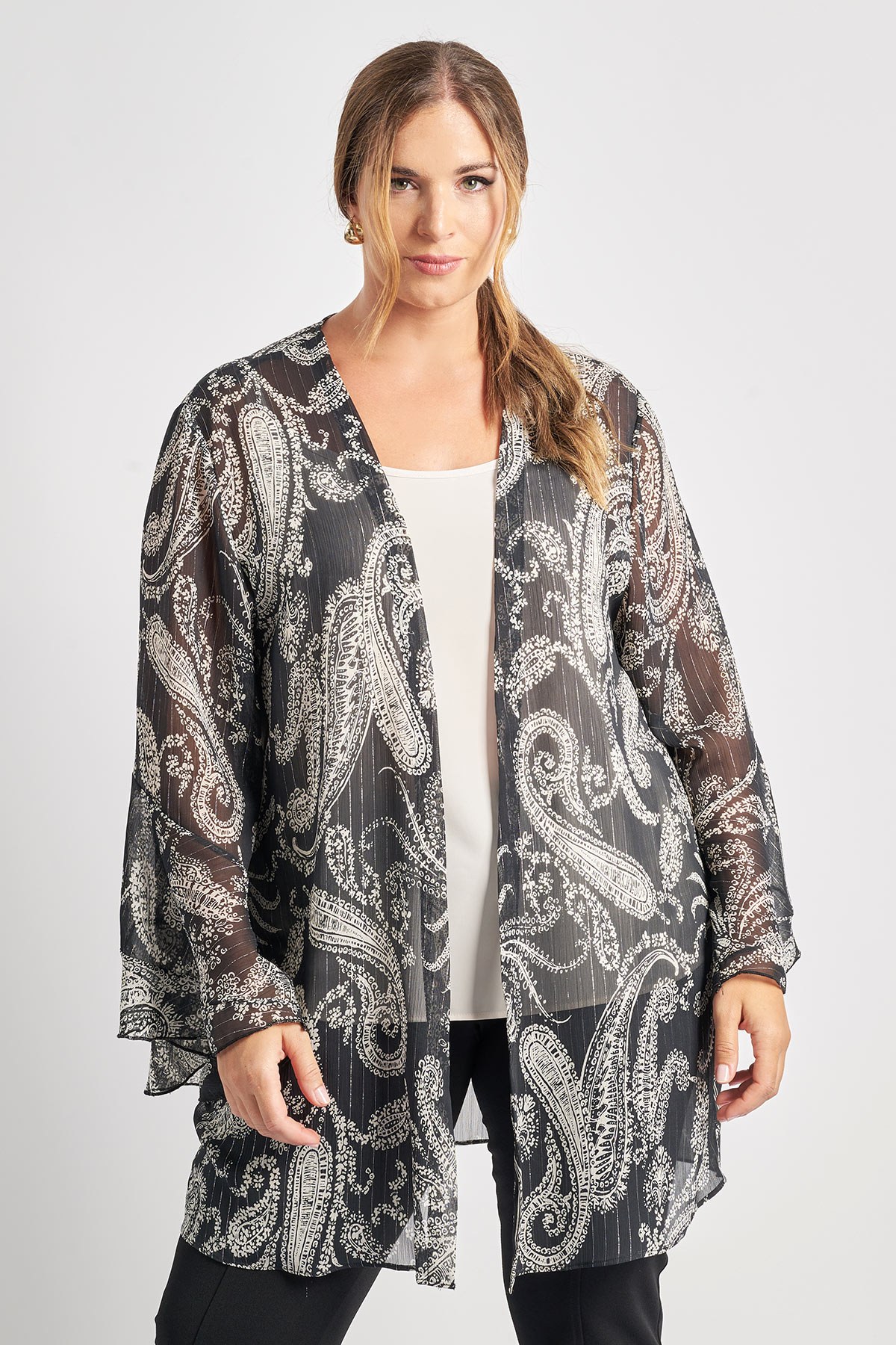 Αναβάθμισε το layering σου με αυτό το ανάλαφρο εμπριμέ κιμονό σε μοτίβο με λαχούρια και διακριτικές lurex λεπτομέρειες που προσθέτουν λάμψη στην εμφάνιση σου. Η διάφανη υφή του και το ανάλαφρο chiffon ύφασμα χαρίζουν κομψότητα και κίνηση, ενώ το μακρύ μήκος του δημιουργεί μια φίνα σιλουέτα. Ιδανικό για να φορεθεί πάνω από basic τοπ ή slip φόρεμα, προσδίδοντας μια εκλεπτυσμένη πινελιά σε κάθε σου εμφάνιση – από ένα επαγγελματικό σύνολο έως μια βραδινή έξοδο. Το μοντέλο έχει ύψος 180 εκ, στήθος 107, μέση 95, περιφέρεια 122 και φοράει το μέγεθος S