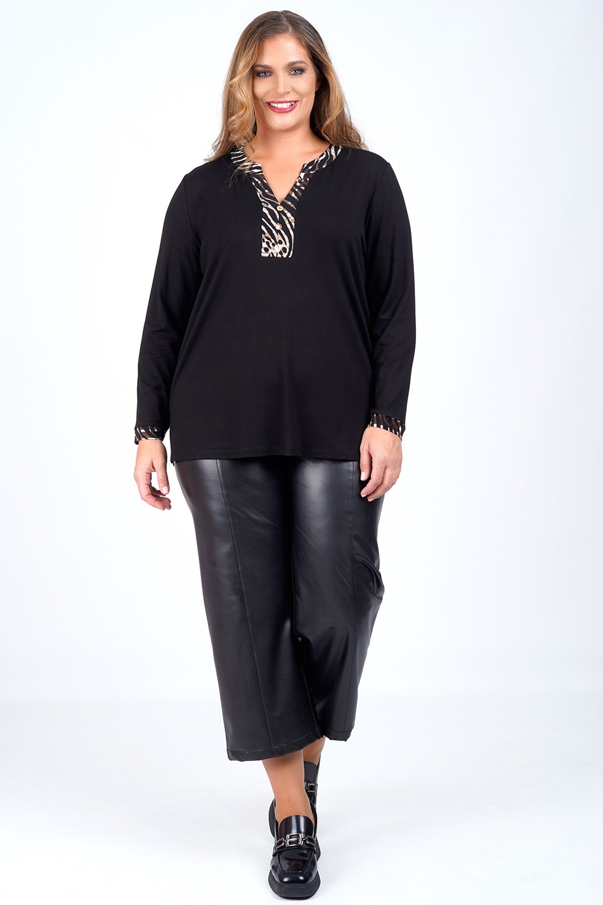 Παντελόνι δερματίνης σε κροπ μήκος. Λεία μέση με άνετη εφαρμογή και διακριτικές κάθετες ραφές. Συνδυάστε με πουκάμισο και blazer για κομψό office wear ή με σατέν πουκάμισο και γόβες για βραδινή έξοδο. Ολοκληρώστε με loafers για smart casual αποτέλεσμα