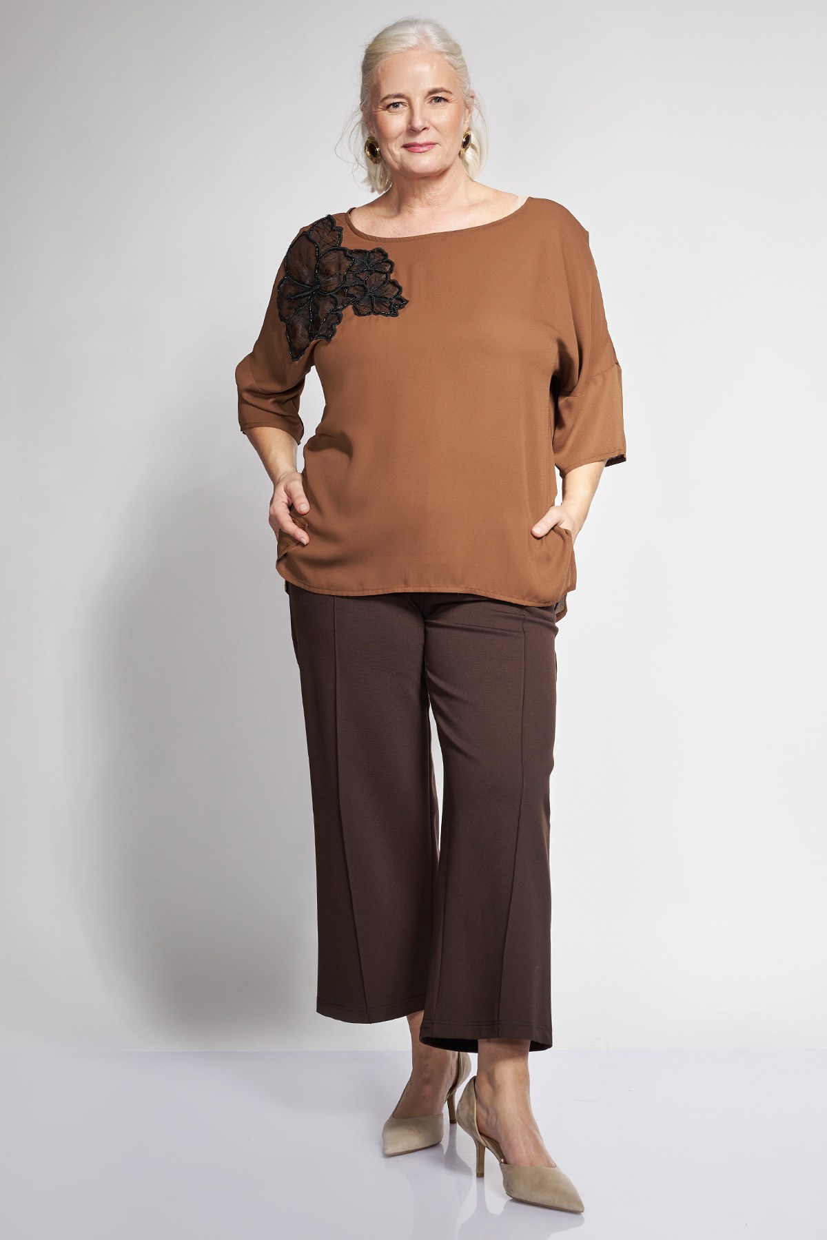 Προσδώστε μια νότα κύρους και εκλεπτυσμένης αισθητικής στις εμφανίσεις σας με αυτό το παντελόνι που επαναπροσδιορίζει το modern tailoring για τη plus size γυναίκα. Από εξαιρετικής ποιότητας ελαστικό ύφασμα που προσφέρει άψογη δομή και αγκαλιάζει ομοιόμορφα τη σιλουέτα. Χάρη στην ελαστική μέση, εξασφαλίζει ιδανική εφαρμογή για κάθε σωματότυπο ενώ το highlight του σχεδίου είναι η ενσωματωμένη εντυπωσιακή μεταλλική αγκράφα στη μέση, η οποία λειτουργεί ως statement αξεσουάρ και προσθέτει μια πολυτελή λεπτομέρεια. Η ίσια γραμμή του επιμηκύνει οπτικά το πόδι, ενώ οι πλαϊνές χρηστικές τσέπες προσδίδουν στην tailored αισθητική του. Η άψογη εφαρμογή και το 7/8 μήκος το καθιστούν ένα απαραίτητο κομμάτι που συνδυάζει τη θηλυκότητα με τον δυναμισμό. Για καθημερινή χρήση, συνδυάστε το με ένα λεπτό πλεκτό top και δερμάτινα loafers για ένα chic look που θα σας συνοδεύσει με στυλ στις καθημερινές σας υποχρεώσεις ενώ για ένα Office look, φφορέστε το με ένα λευκό πουκάμισο περασμένο από μέσα για να φαίνεται η αγκράφα, και ένα μεσάτο blazer. Για μία βραδινή εμφάνιση, επιλέξτε ένα μαύρο satin body, ψηλοτάκουνες γόβες και εντυπωσιακά σκουλαρίκια, αφήνοντας τη μεταλλική λεπτομέρεια στη μέση να δώσει την απαραίτητη λάμψη.