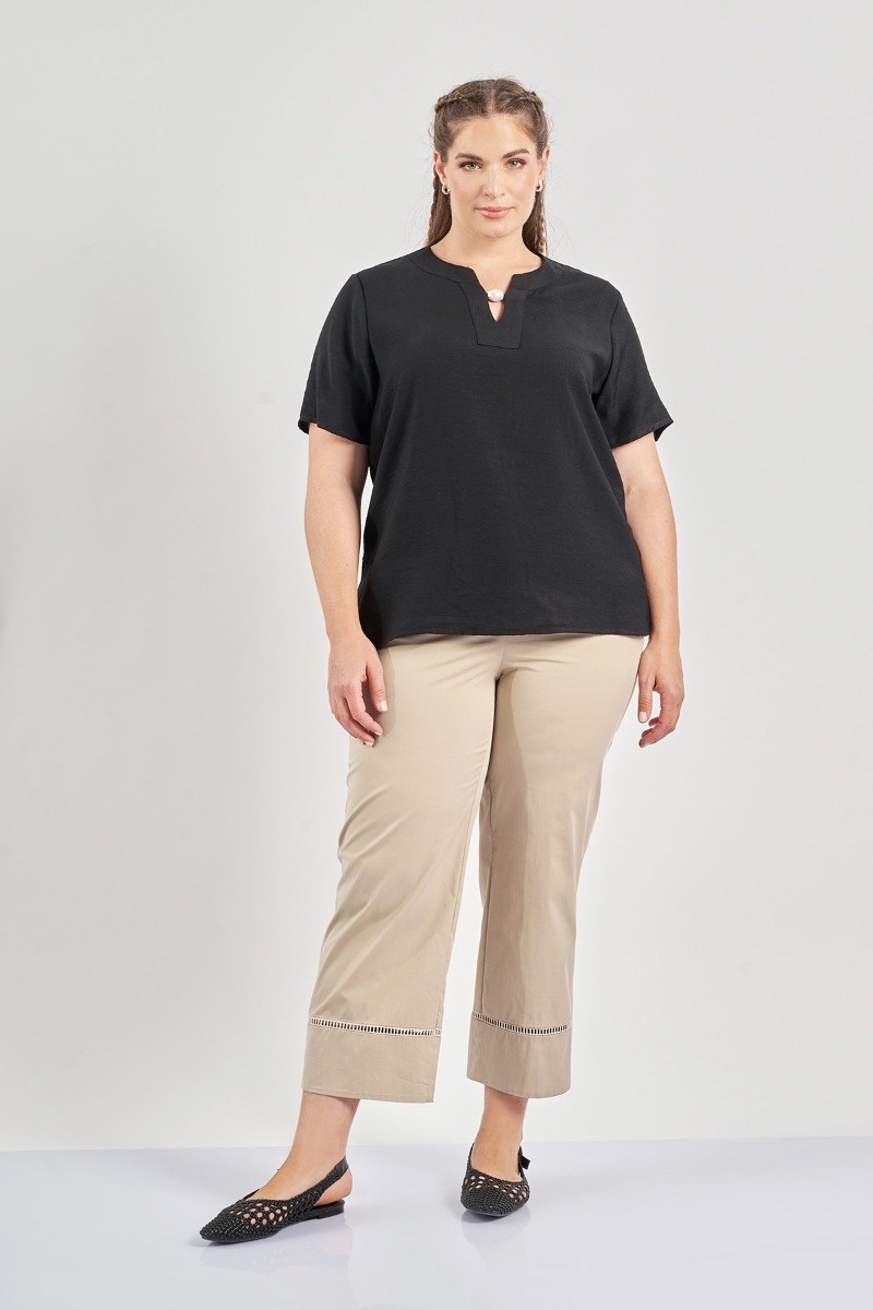 Cropped παντελόνι από ελαστική καμπαρντίνα από σύμμεικτο βαμβακερό. Θηλάκια ζώνης και κούμπωμα με κουμπί και φερμουάρ. Τσεπάκια πλαϊνά. Ελαστική μέση. Τελείωμα με διακοσμητική τρέσα. Το μοντέλο έχει ύψος 172 εκ, στήθος 108, μέση 94, περιφέρεια 111 και φοράει το μέγεθος S
