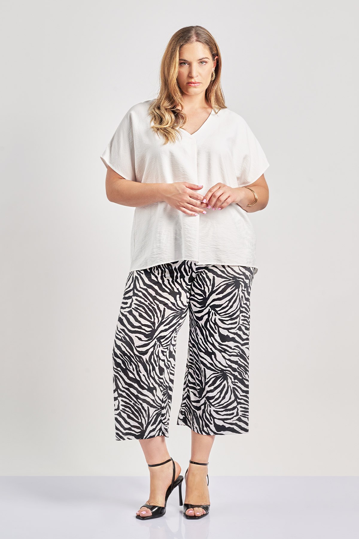 Cropped παντελόνα από ελαστικό και δροσερό σούπερ ζέρσεϊ εμπριμέ. Εσωτερικό λάστιχο στη μέση. Δροσερό και άνετο. Σε ίσια γραμμή. Διατίθεται σε διαφορετικά εμπριμέ μοτίβα. Το μοντέλο έχει ύψος 180 εκ, στήθος 107, μέση 95, περιφέρεια 122 και φοράει το μέγεθος Μ