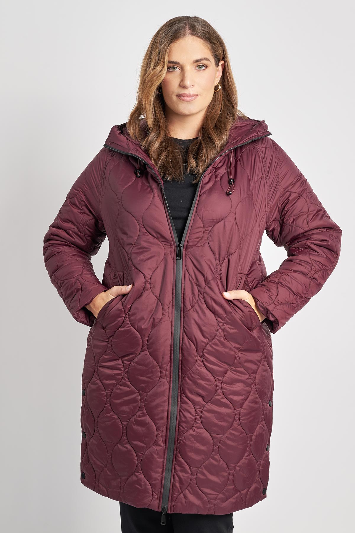 Μακρύ μπουφάν παρκά καπιτονέ με κουκούλα – Μακρύ καπιτονέ μπουφάν με μήκος που φτάνει έως το γόνατο, ιδανικό για απόλυτη προστασία από το κρύο. Διαθέτει σταθερή κουκούλα, φερμουάρ σε όλο το μήκος και διακριτικό κυματιστό καπιτονέ μοτίβο. Η ίσια γραμμή του κολακεύει κάθε σωματότυπο ενώ τα κουμπιά που ανοίγουν στο πλαϊνό τελείωμα προσφέρουν άνεση. Φορέστε το με εφαρμοστό τζιν, χοντρό πλεκτό σκούφο και αρβυλάκια για ένα ολοκληρωμένο χειμερινό urban look. Το μοντέλο έχει ύψος 180 εκ στήθος 107 μέση 95 περιφέρεια 122 και φοράει το μέγεθος S