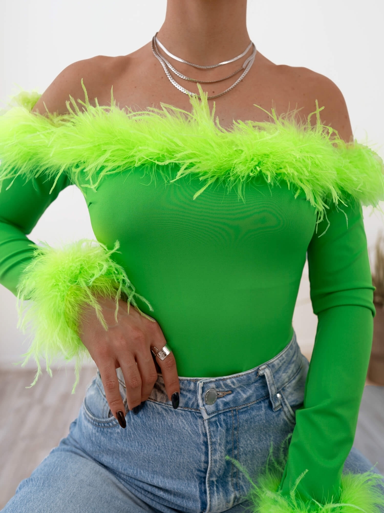 Λαχανί ελαστικό λύκρα κορμάκι  με πούπουλα στα τελειώματα  κλείνει με κόπτσες  διαθέτει μαλακή ενίσχυση  κανονική γραμμή  one size *πλύσιμο στο χέρι με κρύο νερό
