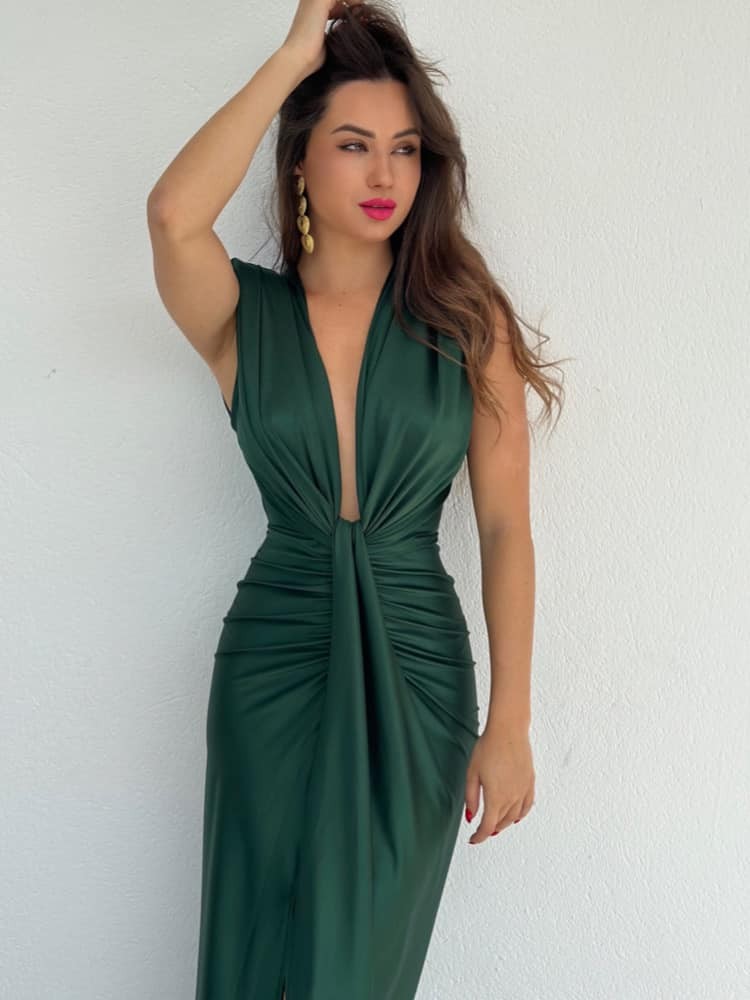 φόρεμα με ανοιχτό ντεκολτέ και σκίσιμο  κανονική γραμμή  one size  Ρεγιόν lycra ύφασμα