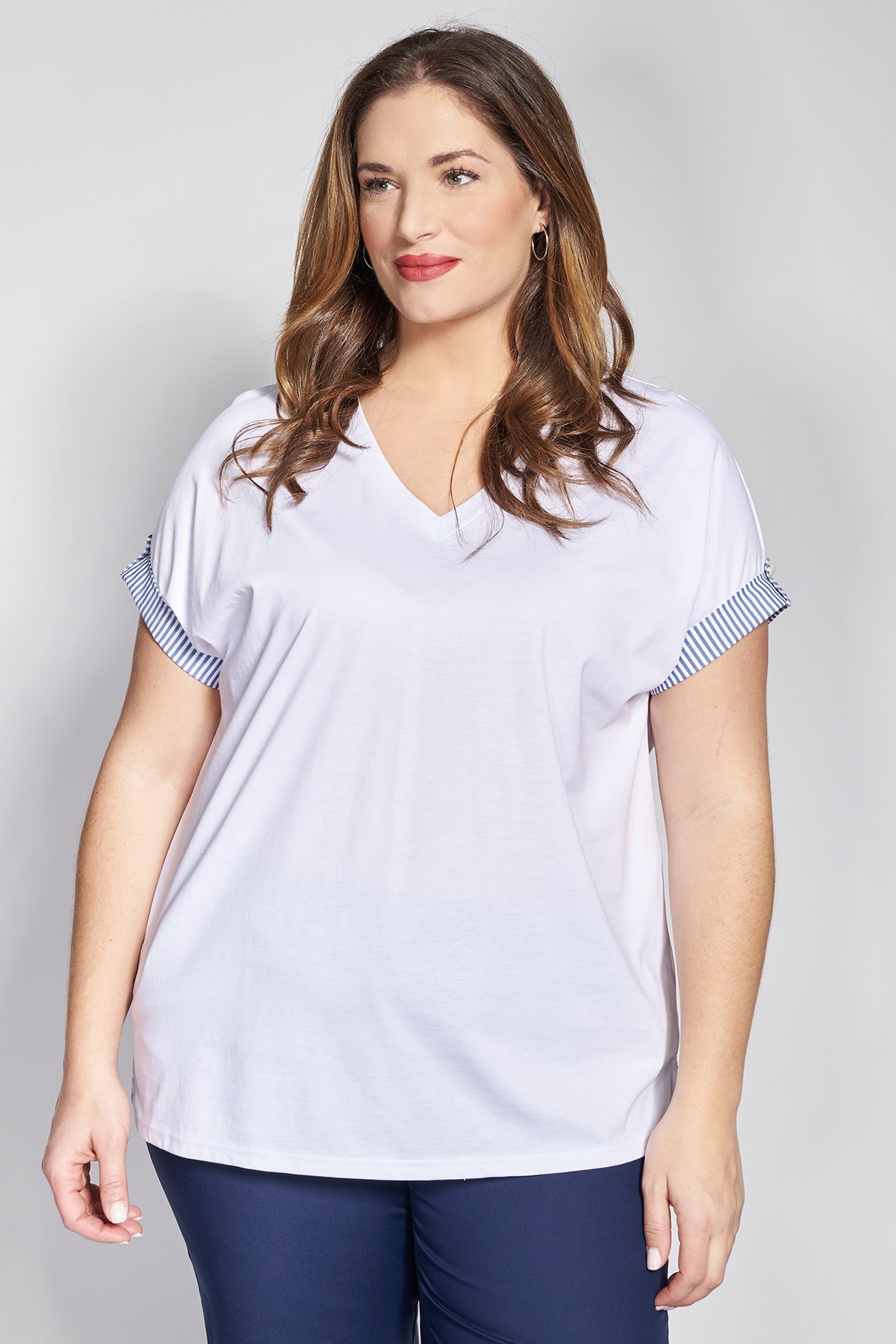 Βαμβακερό t-shirt με V λαιμόκοψη που θα προσδώσει νότα ναυτικής κομψότητας και φρεσκάδας στις εμφανίσεις σας. Από 100% ποιοτικό βαμβακερό ύφασμα εξασφαλίζει εξαιρετική απαλότητα και επιτρέπει στο δέρμα να αναπνέει, προσφέροντας άνεση που διαρκεί όλη μέρα. Το στοιχείο που την κάνει να ξεχωρίζει είναι το ριγέ ρεβέρ στα μανίκια, το οποίο δημιουργεί μια καλαίσθητη αντίθεση και προσθέτει έναν “preppy” χαρακτήρα στο design. Με την άνετη γραμμή της και τη σταθερή λαιμόκοψη, αποτελεί ένα πολυχρηστικό κομμάτι που αναβαθμίζει το κλασσικό στυλ μέσα από προσεγμένες λεπτομέρειες. Casual look: Συνδυάστε το με ένα λευκό παντελόνι ή το αγαπημένο σας denim και boat shoes για ένα διαχρονικό outfit που παραπέμπει σε ιστιοπλοϊκό look. Office look: Φορέστε το με ένα υφασμάτινο παντελόνι, navy blue γιλέκο και μοκασίνια, επιτρέποντας στα ριγέ ρεβέρ να δώσουν μια διακριτική ένταση στο επαγγελματικό σας look. Το μοντέλο έχει ύψος 177εκ στήθος 110 μέση 85 περιφέρεια 115 και φοράει μέγεθος S