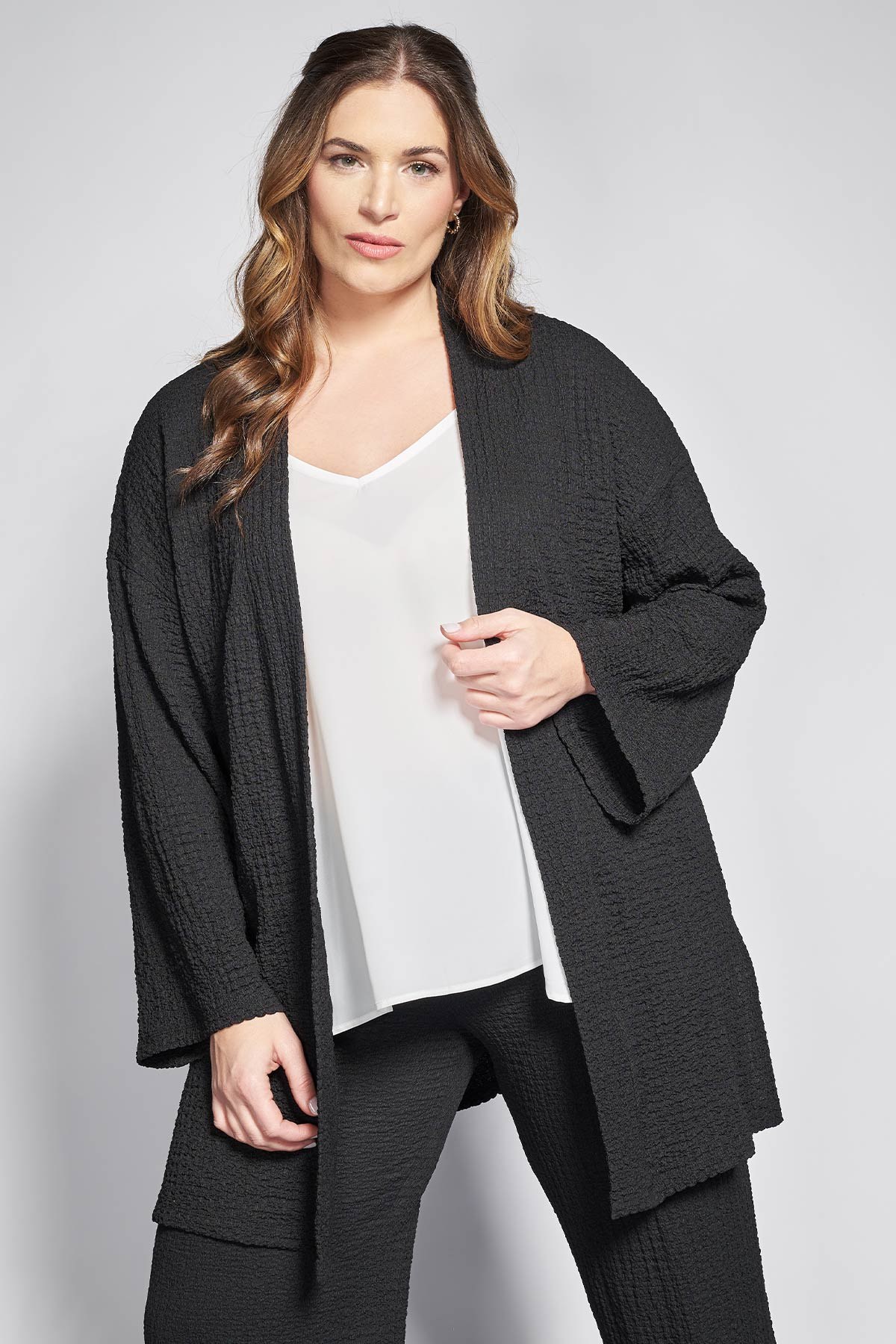 Προσθέστε έναν αέρα ανεπιτήδευτης πολυτέλειας και άνεσης στην γκαρνταρόμπα σας με αυτή τη ζακέτα κιμονό, που αποτελεί το ιδανικό κομμάτι για κομψό layering. Η κατασκευή της από γκοφρέ ζέρσεϊ χαρίζει μια ιδιαίτερη ανάγλυφη υφή που δεν τσαλακώνει, ενώ προσφέρει την ελαστικότητα και την απαλή αίσθηση που αναζητάτε στην καθημερινότητά σας. Το σχέδιο ακολουθεί την παραδοσιακή γραμμή του κιμονό με τα φαρδιά, αέρινα μανίκια και τη ρευστή πτώση, ενώ η συνοδευτική ζώνη σάς επιτρέπει να ορίσετε τη σιλουέτα σας ανάλογα με τη διάθεσή σας. Η χαλαρή της εφαρμογή αγκαλιάζει αρμονικά το σώμα, καθιστώντας την μια εξαιρετικά ευέλικτη επιλογή που συνδυάζει το loungewear στυλ με την απόλυτη θηλυκότητα. Casual look: Φορέστε τη ανοιχτή πάνω από ένα απλό tank top και ένα denim παντελόνι με sneakers για μια χαλαρή βόλτα με άποψη. Evening look: Αναδείξτε την πάνω από ένα lingerie φόρεμα, προσθέτοντας ψηλοτάκουνα πέδιλα και statement κοσμήματα για μια εντυπωσιακή βραδινή εμφάνιση που αποπνέει αυτοπεποίθηση. Total look: Συμπληρώστε το σετ με την παντελόνα από γκοφρέ ζέρσεϊ 012610208407 ή την φούστα ζέρσεϊ γκοφρέ 012610300211. Εναλλακτικά, φορέστε τη πάνω από το φόρεμα ζέρσεϊ γκοφρέ 012610600215. Το μοντέλο έχει ύψος 180 εκ στήθος 107 μέση 95 περιφέρεια 122 και φοράει το μέγεθος S