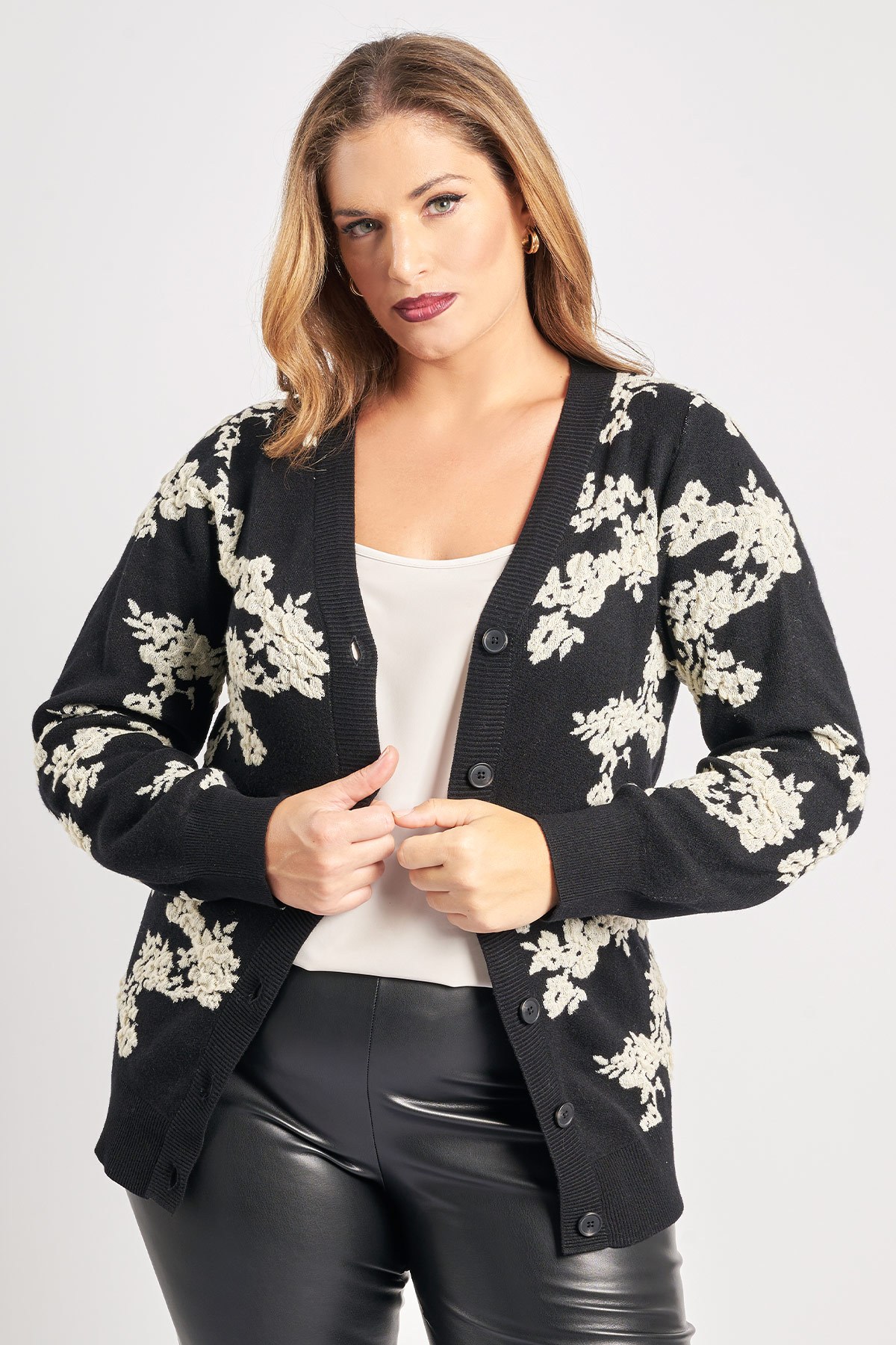 Πλεκτή ζακέτα από σύμμεικτη βισκόζη σε φλοράλ μοτίβο. V λαιμόκοψη και κούμπωμα με κουμπιά. Μακριά μανίκια με ριπ μανσέτες. Κανονική εφαρμογή. Αυτή η ελαφριά ζακέτα είναι το τέλειο κομμάτι, ιδανικό για layering ή για να ξεχωρίζει από μόνη της. Αναδείξτε τη με ένα τζιν παντελόνι για καθημερινές επιλογές ή προτιμήστε μια φούστα και μπότες τις μέρες που θέλετε κάτι λιγότερο casual.