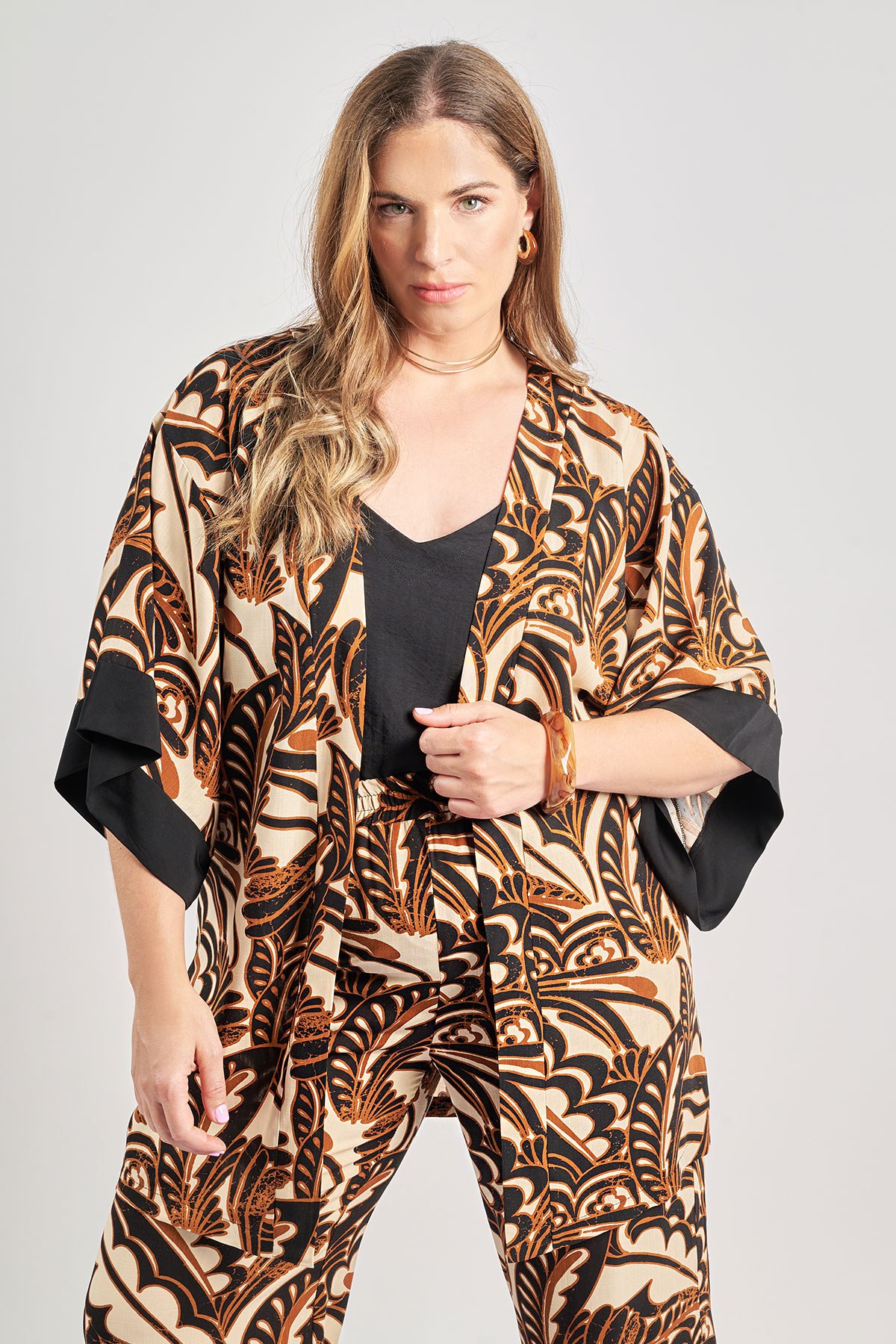 Κιμονό σε φλοράλ εμπριμέ. Μανίκια 3/4 με μονόχρωμο τελείωμα. Χωρίς κούμπωμα. Ολοκληρώστε το σετ με την παντελόνα 012520208914. Το μοντέλο έχει ύψος 180 εκ, στήθος 107, μέση 95, περιφέρεια 122 και φοράει το μέγεθος S