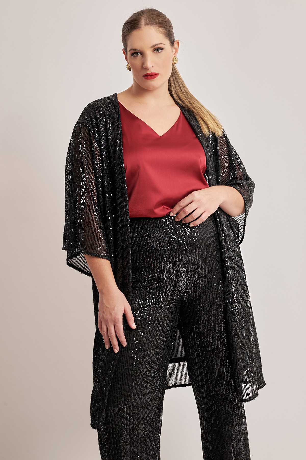 Μακρύ κιμονό με παγιέτες. Χωρίς κούμπωμα. Φαρδιά μανίκια 3/4. Με φόδρα. Συμπληρώστε το σετ με την παντελόνα παγιέτα 012420205265. Το μοντέλο έχει ύψος 180 εκ, στήθος 107, μέση 95, περιφέρεια 122 και φοράει το μέγεθος S