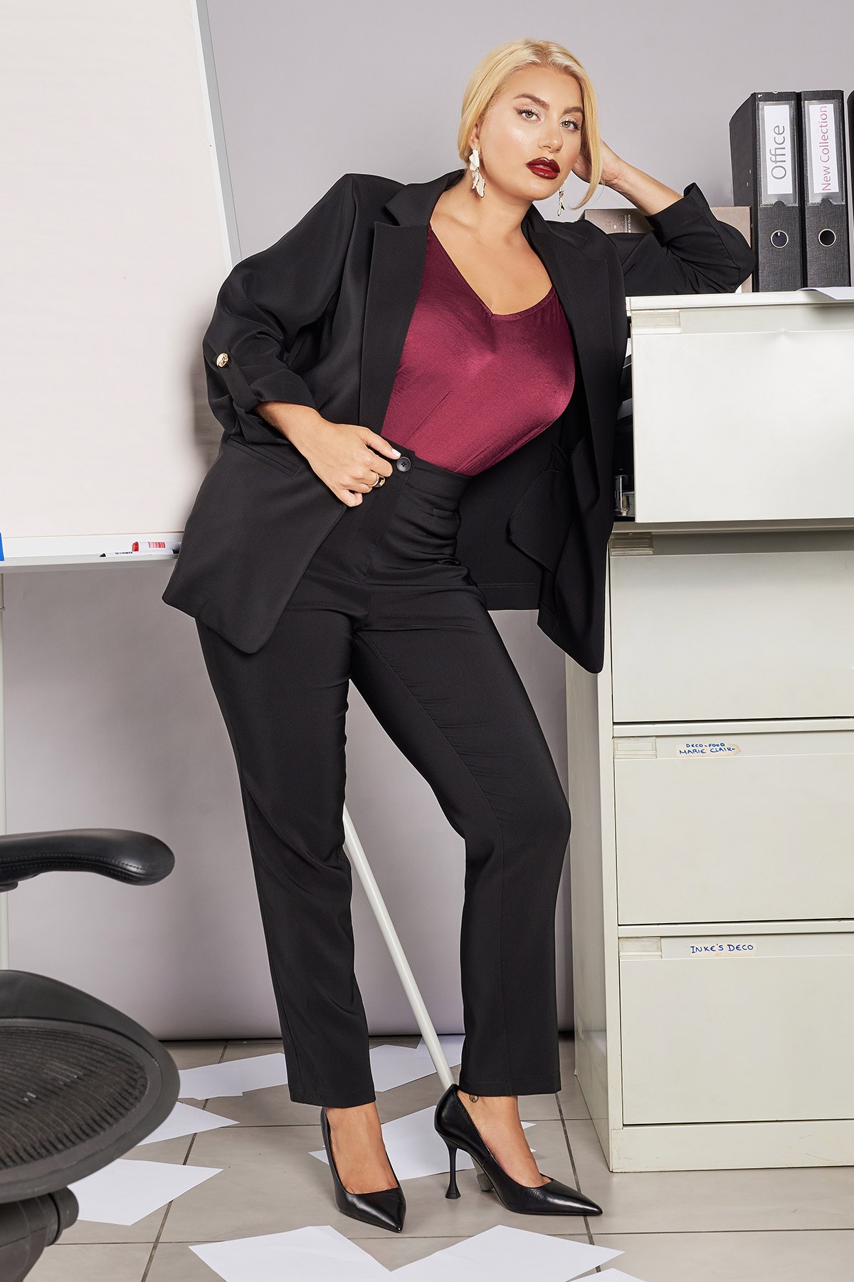 Κρεπ ελαστικό παντελόνι ανορθωτικό σε στενή γραμμή. Διαθέτει κούμπωμα με κουμπί και φερμουάρ. Ένα κλασσικό παντελόνι που φοριέται σε κάθε περίσταση, από το γραφείο μέχρι τη βραδινή βόλτα. Συμπληρώστε το κοστούμι με το σακάκι 012520709393. Το μοντέλο έχει ύψος 177εκ, στήθος 110, μέση 85, περιφέρεια 115 και φοράει μέγεθος S