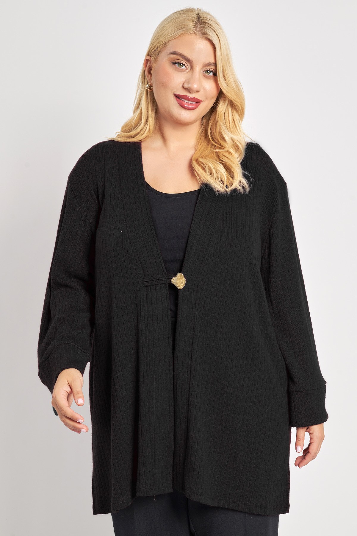 Μακριά πλεκτή ριπ ζακέτα με μεταλλικό κούμπωμα