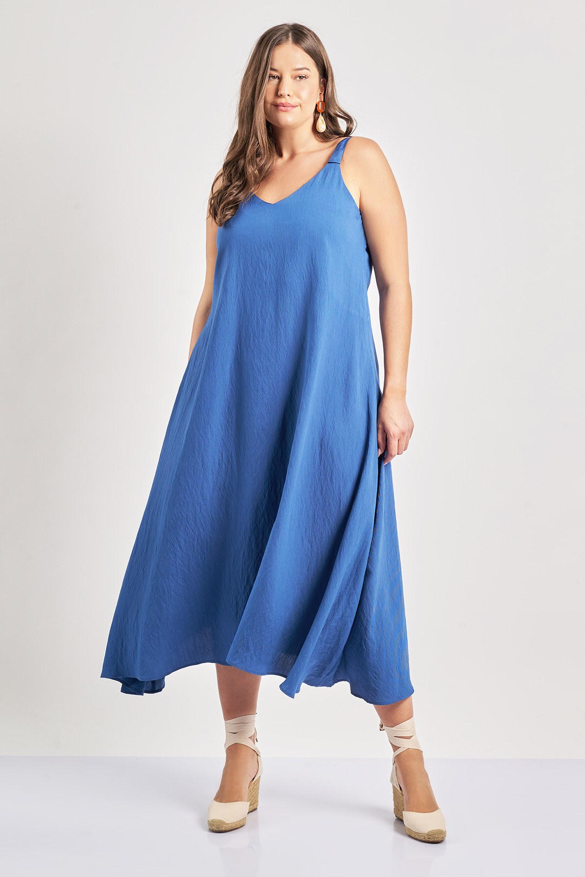 Μακρύ φόρεμα από σύμμεικτο ρεγιόν με όψη λινού. V λαιμόκοψη. Φαρδιές τιράντες με διακοσμητική τρέσα δαντέλας. Κλος φούστα με ασύμμετρία. Το μοντέλο έχει ύψος 180 εκ, στήθος 114, μέση 88, περιφέρεια 121 και φοράει το μέγεθος S