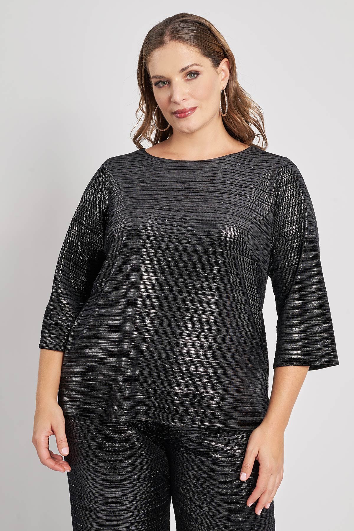 Αυτό το εντυπωσιακό βελουτέ τοπ με άνετη, ίσια γραμμή και στρογγυλή λαιμόκοψη είναι ιδανικό για βραδινή εμφάνιση και γιορτινό look. Διαθέτει πλούσια foil διακόσμηση σε όλη την επιφάνεια και 3/4 μανίκια με φαρδιά γραμμή. Είναι ένα statement κομμάτι και ολοκληρώνει το σετ με το παντελόνι 012520287249. Το μοντέλο έχει ύψος 180 εκ στήθος 107 μέση 95 περιφέρεια 122 και φοράει το μέγεθος S