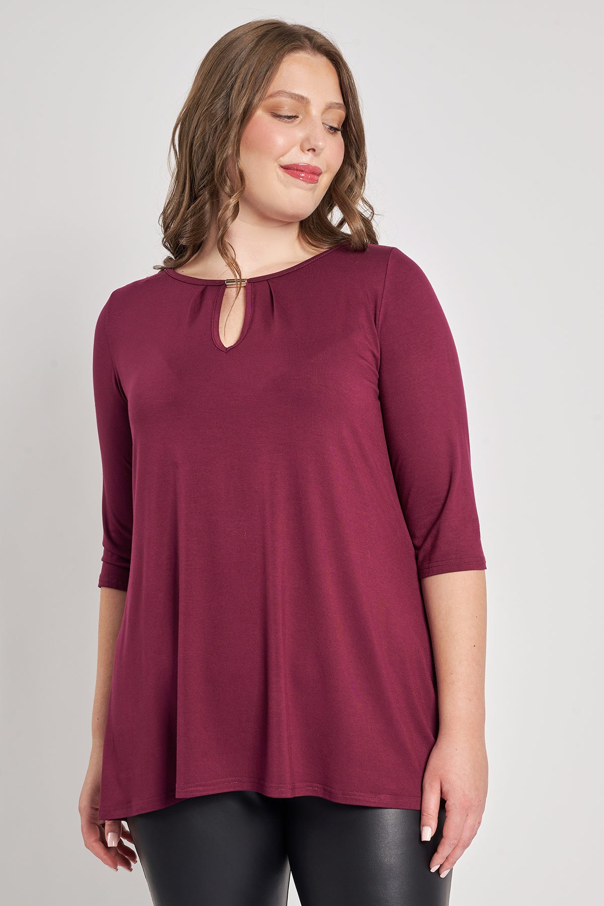 Μπλούζα από ελαστικό ζέρσεϊ φυτικής ίνας bamboo. Στρογγυλή λαιμόκοψη με άνοιγμα και διακοσμητικό μεταλλάκι. Μανίκια 3/4. Σε μακριά Α-γραμμή που κολακεύει και καλύπτει τους γοφούς. Το μοντέλο έχει ύψος 180 εκ, στήθος 107, μέση 95, περιφέρεια 122 και φοράει το μέγεθος S
