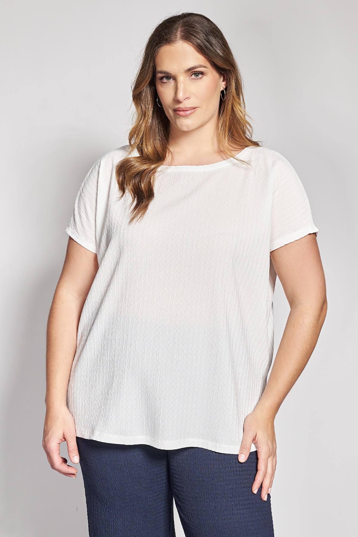 Ανανεώστε τη συλλογή των basic κομματιών σας με μια μπλούζα που δίνει νέα διάσταση στην άνεση μέσα από την ιδιαίτερη υφή της. Η κατασκευή της από γκοφρέ ζέρσεϊ προσφέρει μια μοναδική ανάγλυφη όψη, η οποία πέρα από το αισθητικό ενδιαφέρον, εξασφαλίζει ότι το ύφασμα δεν εφάπτεται πλήρως στο δέρμα, επιτρέποντας την καλύτερη κυκλοφορία του αέρα. Το ελαστικό αυτό υλικό διακρίνεται για την ανθεκτικότητά του και το γεγονός ότι δεν απαιτεί σιδέρωμα, καθιστώντας την μπλούζα την πλέον πρακτική επιλογή για την καθημερινότητά σας. Με κοντά μανίκια, στρογγυλή λαιμόκοψη και σύγχρονη γραμμή, το ρούχο αυτό αγκαλιάζει τη σιλουέτα προσφέροντας μια κομψή, τρισδιάστατη όψη που ξεφεύγει από το κλασικό λείο φινίρισμα. Casual look: Συνδυάστε τη με μία παντελόνα ή το αγαπημένο σας τζιν και sneakers για ένα ανάλαφρο, καθημερινό σύνολο με έμφαση στις υφές. Office look: Φορέστε τη μέσα από ένα κοστούμι ή με μια ψηλόμεση φούστα, επιτρέποντας στο γκοφρέ ύφασμα να δώσει μια μοντέρνα πινελιά στο αυστηρό επαγγελματικό στυλ. Evening look: Αναδείξτε την απλότητά της προσθέτοντας εντυπωσιακά αξεσουάρ, μια μεταξωτή παντελόνα και πέδιλα για μια προσεγμένη εμφάνιση που αποπνέει φρεσκάδα. Total look: Συμπληρώστε το σετ με την παντελόνα από γκοφρέ ζέρσεϊ 012610208407ή την φούστα ζέρσεϊ γκοφρέ 012610300211. Το μοντέλο έχει ύψος 180 εκ στήθος 107 μέση 95 περιφέρεια 122 και φοράει το μέγεθος S