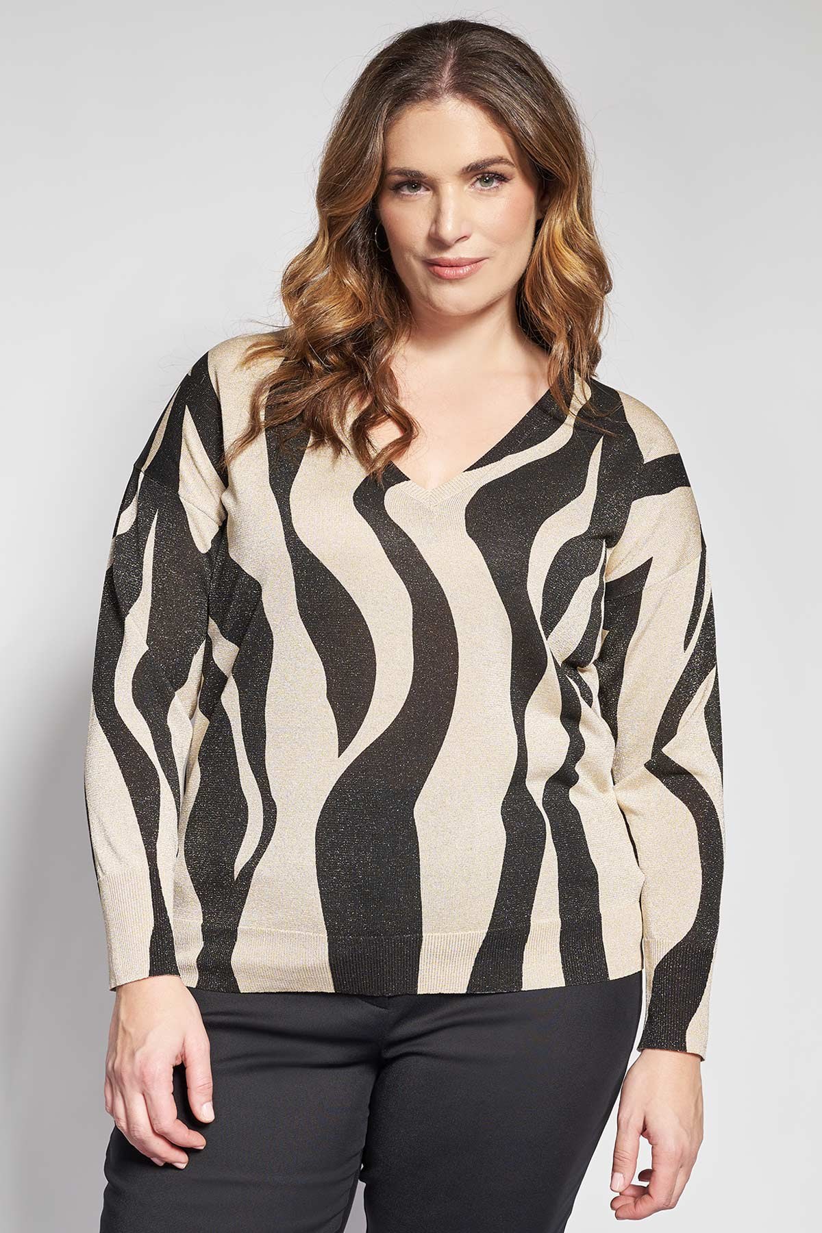 Εντυπωσιάστε σε κάθε σας βήμα με μια μπλούζα που συνδυάζει την τόλμη του animal print με την πολυτέλεια της διακριτικής λάμψης. Είναι κατασκευασμένη από λεπτό πλεκτό ύφασμα με νήμα λούρεξ, που χαρίζει μια σοφιστικέ γυαλάδα ενώ παραμένει ανάλαφρο και απαλό στην επαφή με το δέρμα. Η λαιμόκοψη V προσφέρει ένα θηλυκό αποτέλεσμα που επιμηκύνει τον λαιμό, ενώ το animal μοτίβο δημιουργεί μια διαχρονικά μοντέρνα αισθητική. Τα μακριά μανίκια με χαμηλωμένους ώμους ενισχύουν την άνεση, προσδίδοντας ταυτόχρονα έναν αέρα ανεπιτήδευτης κομψότητας. Η γραμμή της είναι ;άνετη, με μήκος που αγκαλιάζει σωστά τους γοφούς και προσφέρει άψογη εφαρμογή χωρίς να πιέζει. Το ρούχο ολοκληρώνεται με λεπτό rib τελείωμα στις μανσέτες και στο κάτω μέρος, διασφαλίζοντας ότι η μπλούζα διατηρεί τη φόρμα της όλη μέρα. Συνδυάστε τη με ένα μαύρο denim παντελόνι και δερμάτινα μποτάκια για μια καθημερινή εμφάνιση που αποπνέει αυτοπεποίθηση. Φορέστε τη μέσα από ένα μαύρο blazer, συνδυασμένη με υφασμάτινο παντελόνι σε ίσια γραμμή και γόβες, δημιουργώντας ένα δυναμικό και κομψό business look. Για μια βραδινή έξοδο, αναδείξτε τη λάμψη του λούρεξ επιλέγοντας μια δερμάτινη φούστα ή ένα παντελόνι σε leather look και εντυπωσιακά χρυσά σκουλαρίκια. Το μοντέλο έχει ύψος 180 εκ στήθος 107 μέση 95 περιφέρεια 122 και φοράει το μέγεθος S