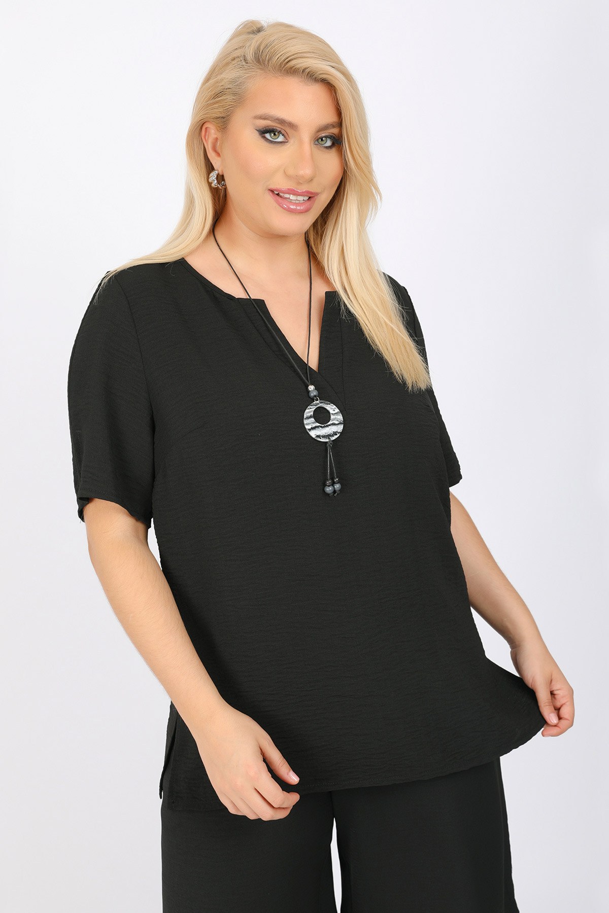 Μπλούζα σε ανάλαφρο ύφασμα washed με ανάγλυφη υφή. Στρογγυλή λαιμόκοψη με V άνοιγμα. Κοντά μανίκια. Σε ίσια γραμμή με πλαϊνά ανοίγματα. Διατίθεται μαζί με κολιέ που δύναται να διαφέρει από αυτό της φωτογραφίας. Το μοντέλο έχει ύψος 180 εκ, στήθος 107, μέση 95, περιφέρεια 122 και φοράει το μέγεθος S