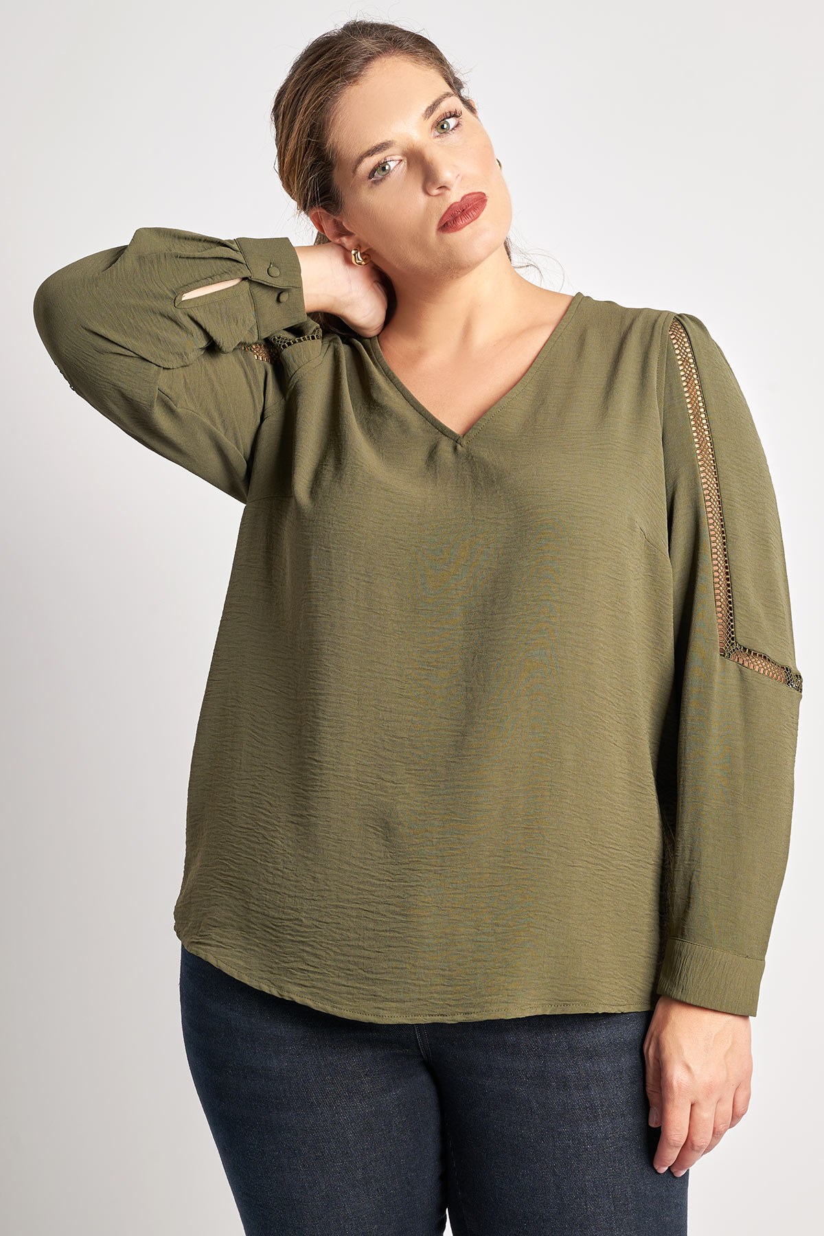 Μονόχρωμη μπλούζα με μακριά μανίκια. Λαιμόκοψη V και διάτρητη διακόσμηση στα μανίκια.