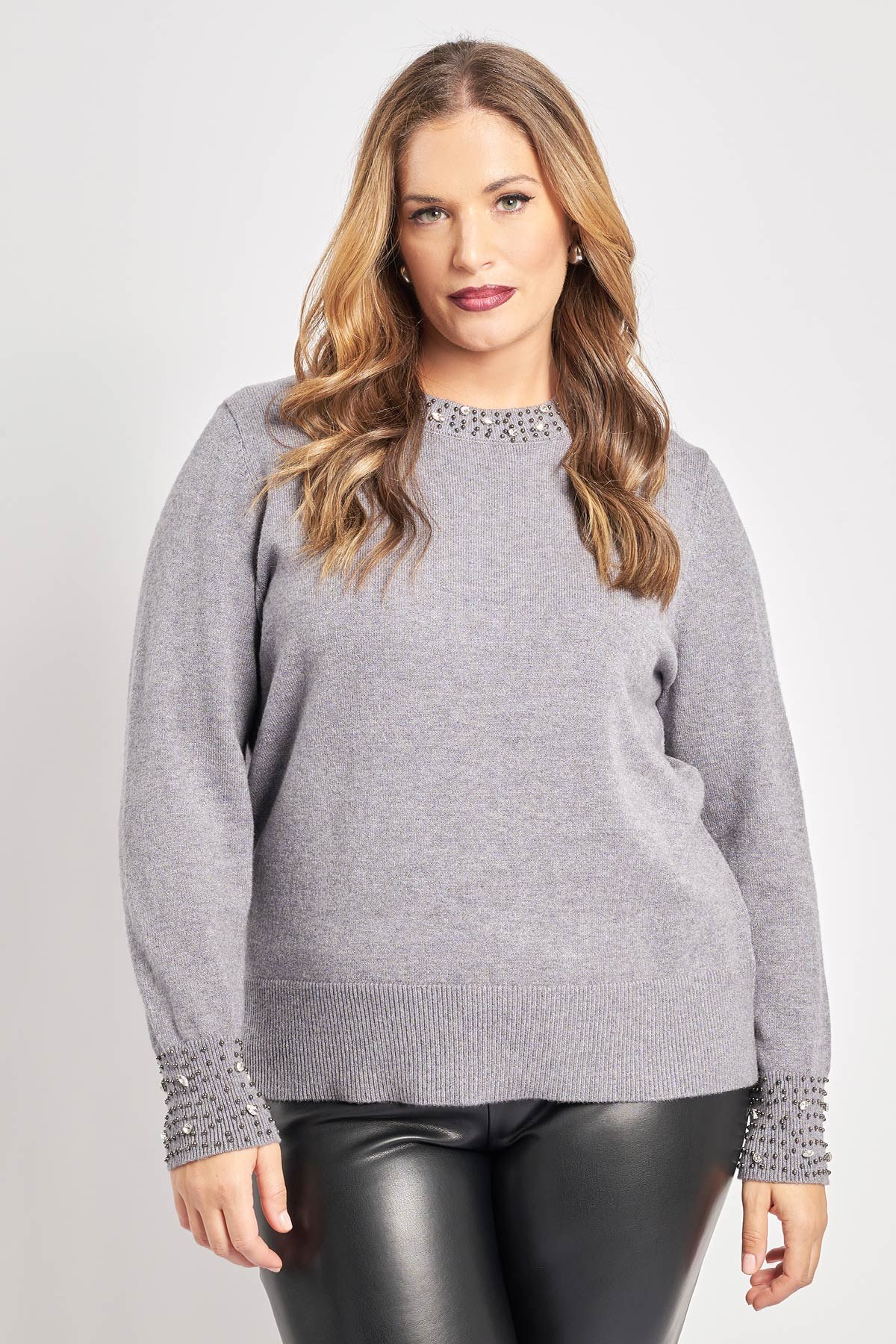 Πλεκτή μπλούζα από σύμμεικτη βισκόζη. Μακριά μανίκια με ριπ λεπτομέρεια στη μανσέτα και λαιμόκοψη λουπέτο. Διακόσμηση με στρας στη λαιμόκοψη, τα μανίκια και το τελείωμα. Το μοντέλο έχει ύψος 180 εκ, στήθος 107, μέση 95, περιφέρεια 122 και φοράει το μέγεθος S