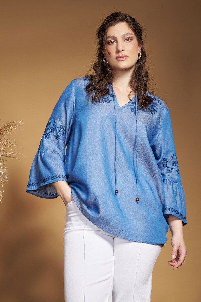 Μπλούζα tencel όψη τζιν με κεντητή μπορντούρα