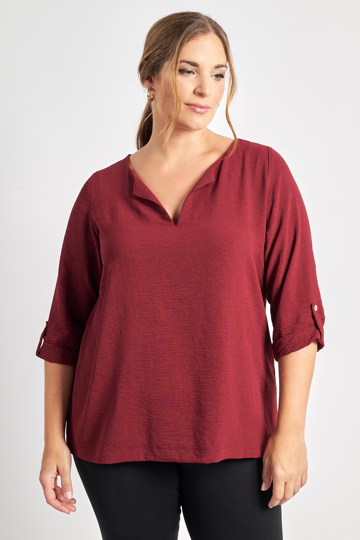 Μπλούζα από ανάλαφρη ύφανση washed. V λαιμόκοψη. Μακριά μανίκι που γυρνάνε σε κούμπωμα με κουμπί. Σε άνετη γραμμή. Το μοντέλο έχει ύψος 180 εκ, στήθος 107, μέση 95, περιφέρεια 122 και φοράει το μέγεθος S