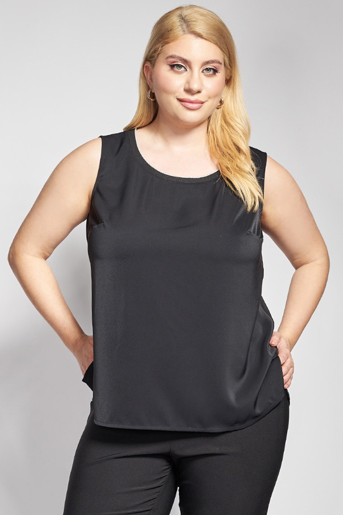 Ένα αμάνικο τοπ που συνδυάζει την καθαρή αισθητική του minimal design με μια πινελιά πολυτέλειας. Το στοιχείο που κλέβει τις εντυπώσεις είναι η στρογγυλή λαιμόκοψη διακοσμημένη με lurex. Η αμάνικη γραμμή του και η προσεγμένη του πτώση το καθιστούν ιδανικό για layering, λειτουργώντας ως το τέλειο κομμάτι που αναβαθμίζει κάθε outfit. Office look: Φορέστε το μέσα από ένα ανοιχτό σακάκι ή μια λεπτή ζακέτα, αφήνοντας τη λάμψη του lurex να αντικαταστήσει το κλασικό κολιέ σε ένα επαγγελματικό look. Evening look: Αναδείξτε το με μια σατινέ παντελόνα και εντυπωσιακά πέδιλα, προσθέτοντας αξεσουάρ σε μεταλλικές αποχρώσεις για μια βραδινή έξοδο που εκπέμπει αυτοπεποίθηση. Το μοντέλο έχει ύψος 177εκ στήθος 110 μέση 85 περιφέρεια 115 και φοράει μέγεθος S