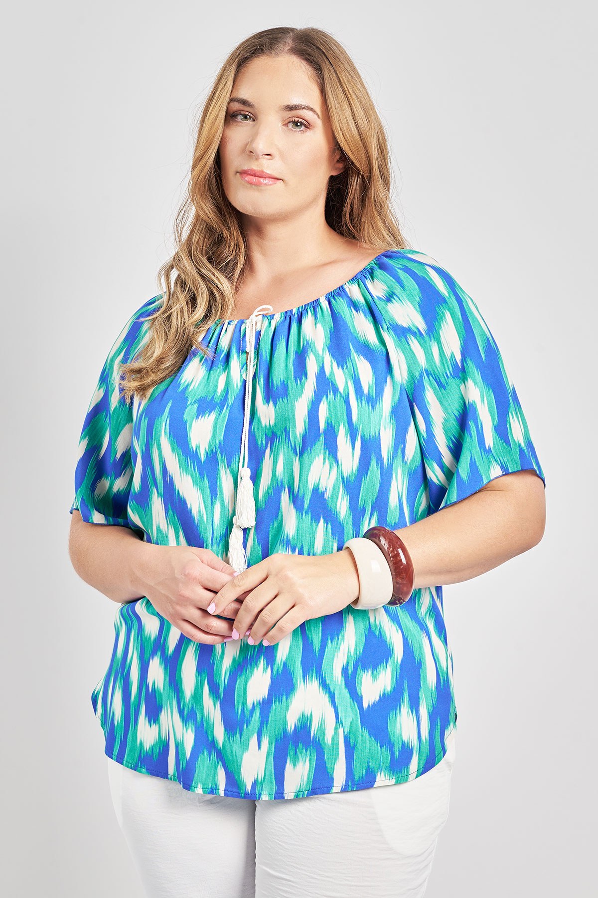 Μπλούζα εμπριμέ από 100% ρεγιόν. Ελαστική στρογγυλή λαιμόκοψη που μπορεί να φορεθεί και off shoulder. Δέσιμο με κορδόνι μπροστά. Το μοντέλο έχει ύψος 180 εκ, στήθος 107, μέση 95, περιφέρεια 122 και φοράει το μέγεθος S