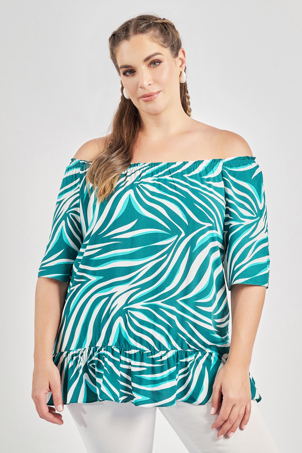 Μπλούζα βισκόζη off-shoulder με βολάν εμπριμέ τρόπικαλ