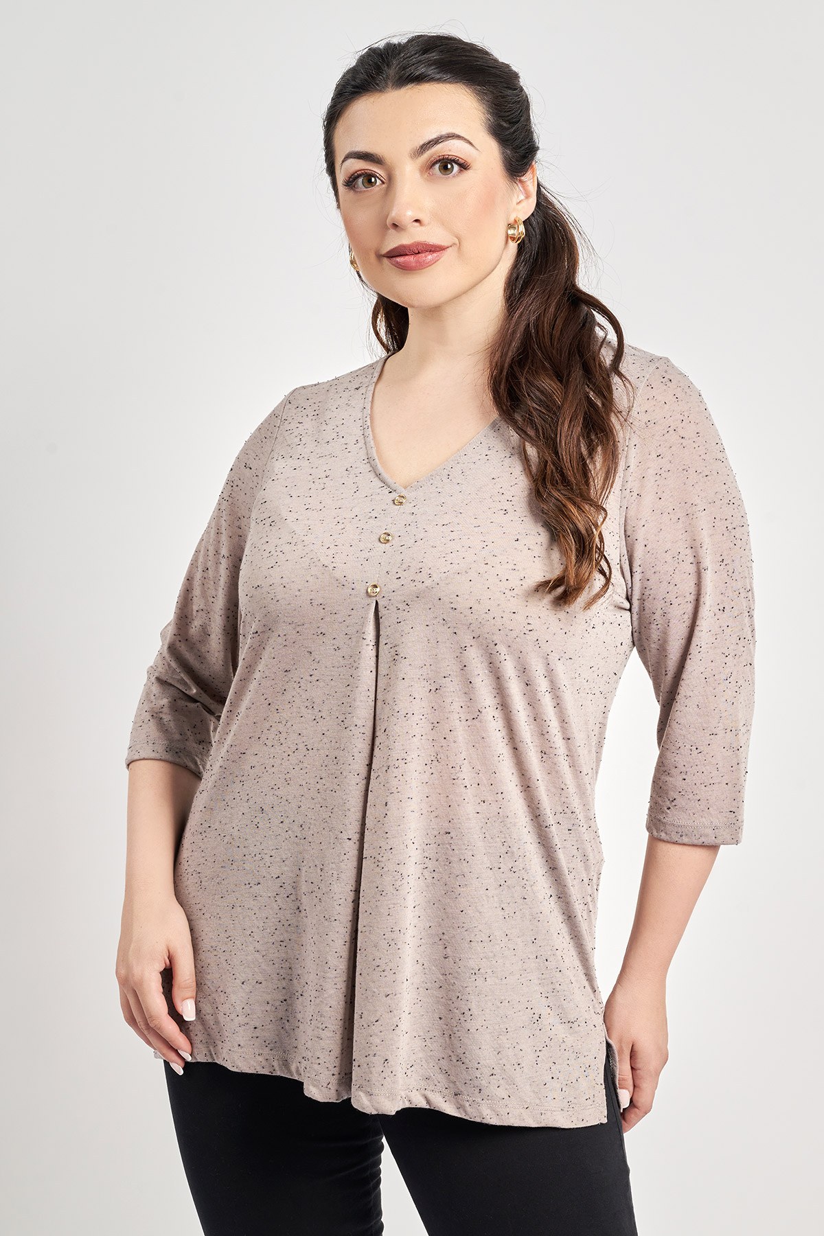 Εμπριμέ μπλούζα με διακόσμηση κουμπί. Λαιμόκοψη V και μανίκια 3/4. Κουφόπιετα μπροστά. Το μοντέλο έχει ύψος 172 εκ, στήθος 108, μέση 94, περιφέρεια 111 και φοράει το μέγεθος S