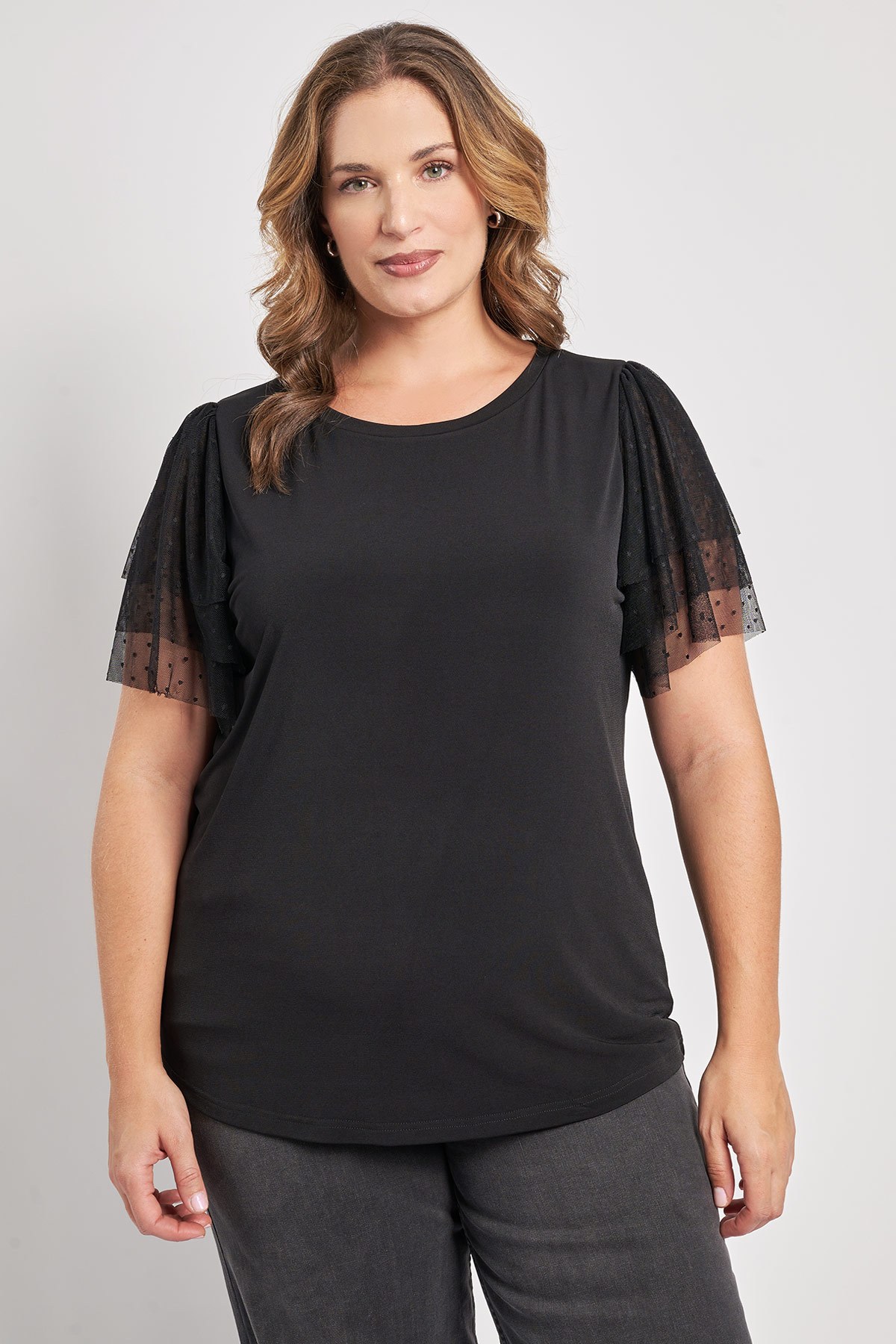 Ελαστική μπλούζα super jersey κοντομάνικη. Στρογγυλή λαιμόκοψη και μανίκια από τούλι. Το μοντέλο έχει ύψος 180 εκ, στήθος 107, μέση 95, περιφέρεια 122 και φοράει το μέγεθος S