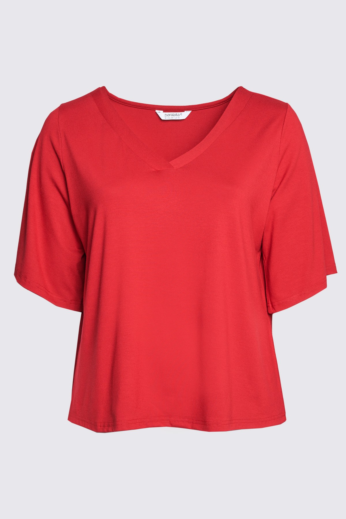 Μπλούζα μεσαίου μήκους από ελαστική ζέρσεϊ βισκόζη. V λαιμόκοψη. Σε ίσια, άνετη γραμμή. Φαρδιά μανίκια που πέφτουν χυτά.