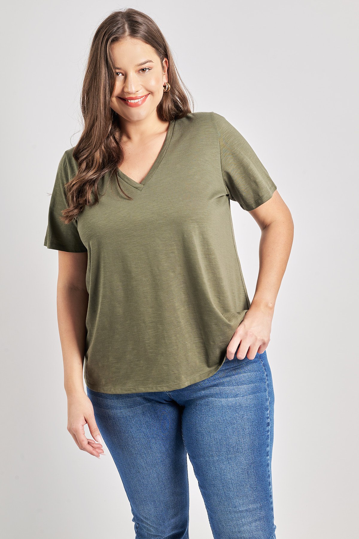 Μπλούζα από 100% βαμβάκι. Κοντά μανίκια και λαιμόκοψη με V. Το μοντέλο έχει ύψος 180 εκ, στήθος 114, μέση 88, περιφέρεια 121 και φοράει το μέγεθος S