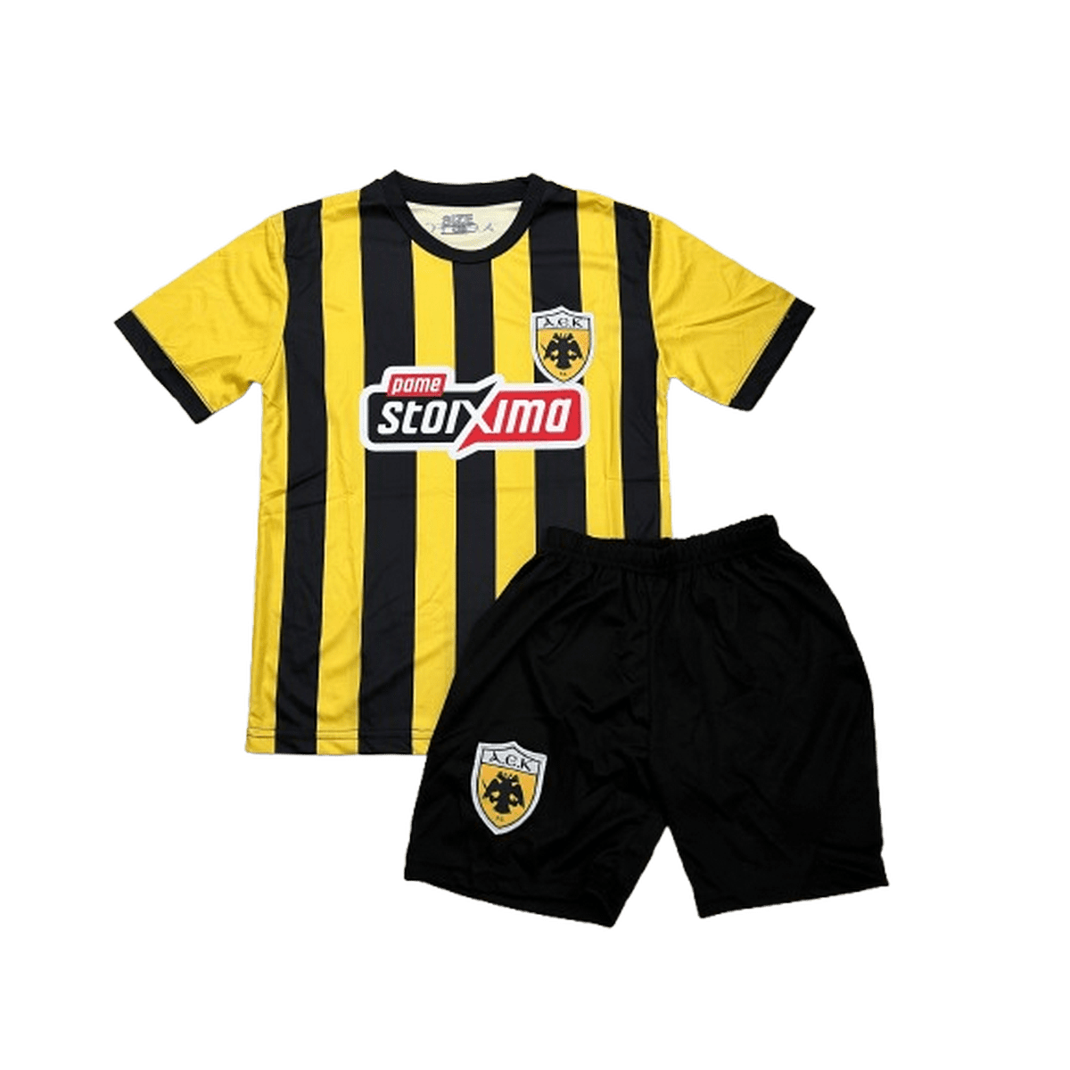 Παιδικό σετ ποδοσφαίρου ΑΕΚ εντός έδρας εμφάνιση σε κιτρινόμαυρο χρώμα με μαύρο σορτς. Το σετ περιλαμβάνει τη μπλούζα και το σορτσάκι. Τα μεγέθη αντιστοιχούν στην ηλικία του παιδιού. Συμβουλευτείτε το μεγεθολόγιο στη συλλογή εικόνων του προϊόντος. Εξαιρετική ποιότητα κατασκευής.