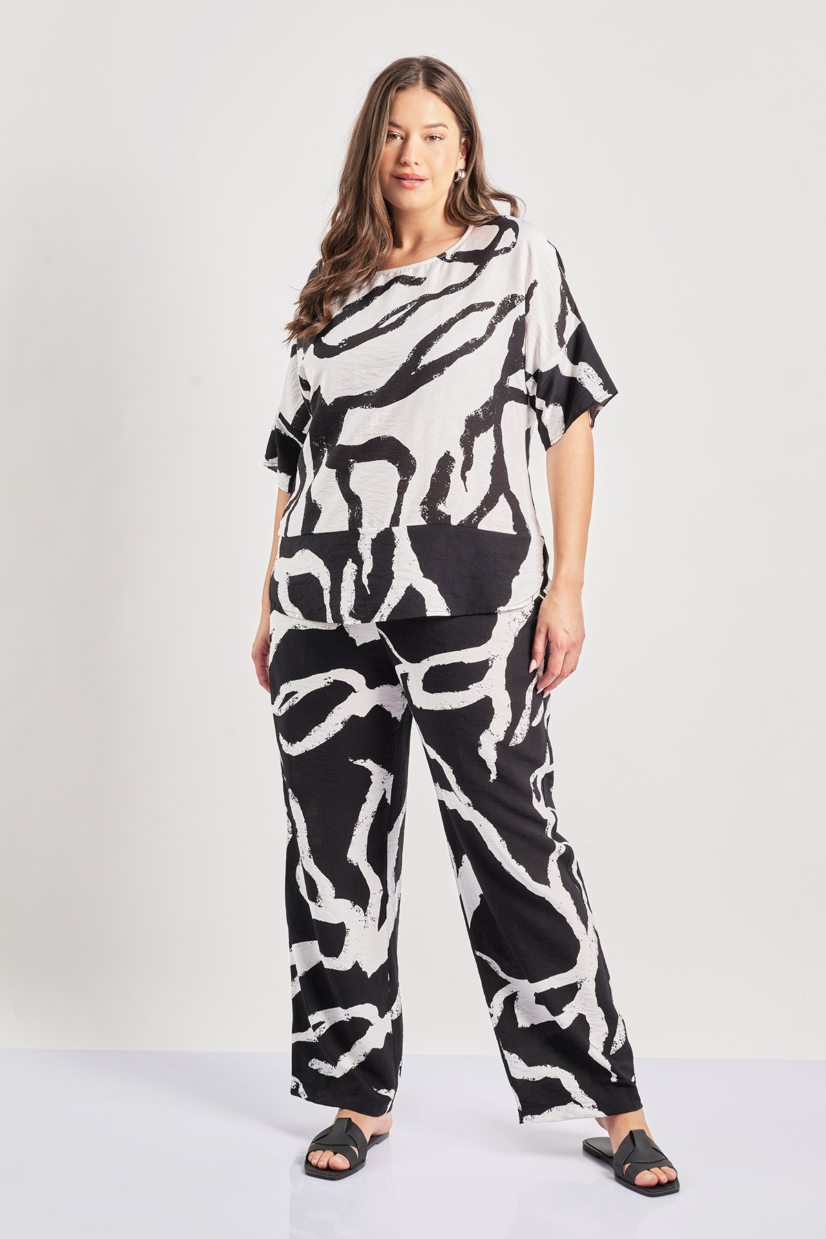 Παντελόνα από σύμμεικτη βισκόζη με όψη λινού και σε εμπριμέ abstract. Λάστιχο στη μέση για άνεση. Ολοκληρώστε το σετ με την μπλούζα 251.1013. Το μοντέλο έχει ύψος 180 εκ, στήθος 114, μέση 88, περιφέρεια 121 και φοράει το μέγεθος S