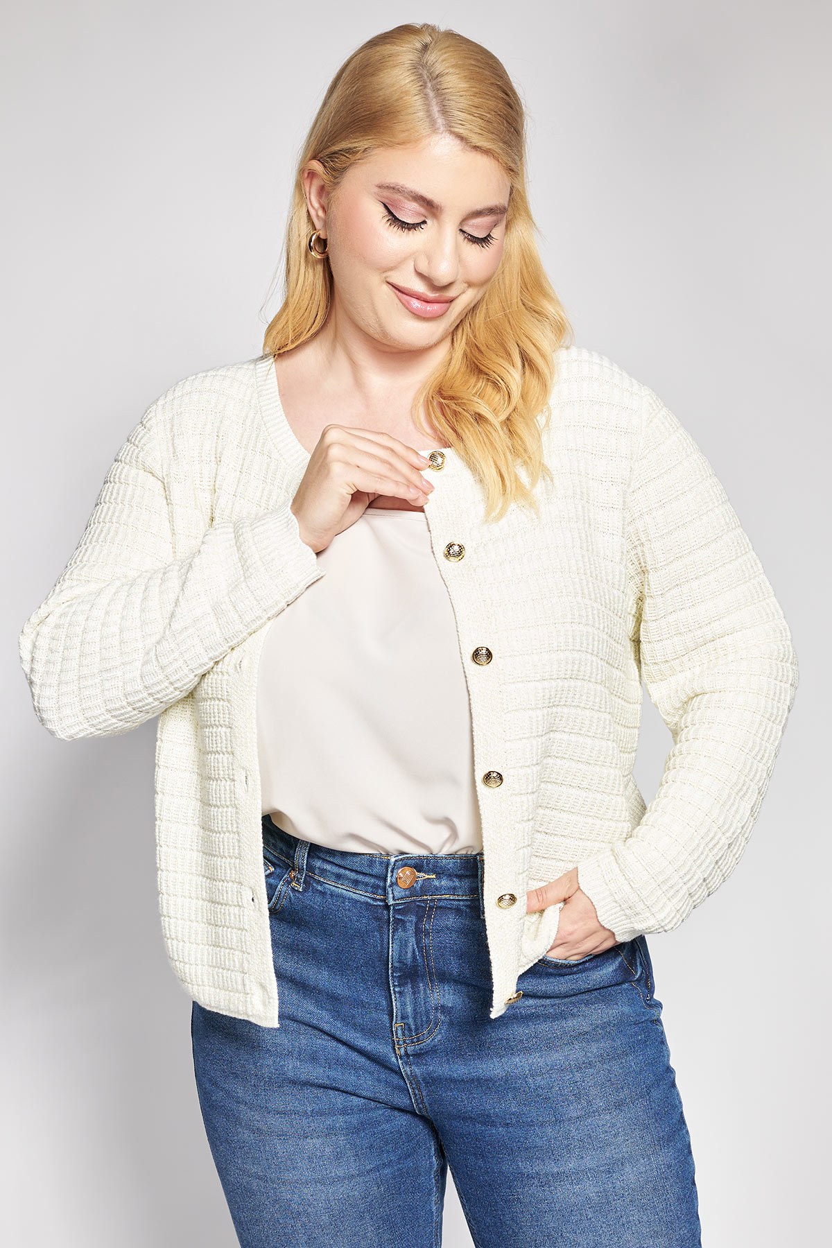 Προσθέστε μια δόση πολυτέλειας και διαχρονικής γοητείας στις εμφανίσεις σας με αυτή την πλεκτή ζακέτα που επαναπροσδιορίζει το κλασικό preppy look. Είναι κατασκευασμένη από νήμα υψηλής ποιότητας με πυκνή πλέξη, προσφέροντας μια σταθερή αλλά ταυτόχρονα μαλακή υφή που αγκαλιάζει το σώμα χωρίς να χάνει τη φόρμα της. Η στρογγυλή λαιμόκοψη προσδίδει έναν αριστοκρατικό αέρα, ενώ το κλείσιμο με τα εντυπωσιακά ανάγλυφα χρυσά κουμπιά στο μπροστινό μέρος λειτουργεί ως κόσμημα για το ρούχο. Η γραμμή της είναι κανονική με μήκος που φτάνει στο ύψος των γοφών, εξασφαλίζοντας μια κομψή και συγκροτημένη σιλουέτα που κολακεύει κάθε plus size γυναίκα. Το διακριτικό rib κυματιστό τελείωμα στις άκρες προσφέρει ένα καθαρό και εκλεπτυσμένο φινίρισμα που ενισχύει την σικάτη γοητεία της.Φορέστε τη ανοιχτή πάνω από ένα απλό τοπ και ένα slim-fit denim παντελόνι για να αναβαθμίσετε άμεσα μια καθημερινή εμφάνιση. Αποτελεί το ιδανικό staple για το γραφείο αν συνδυαστεί με μια pencil φούστα ή ένα υφασμάτινο παντελόνι σε cigarette γραμμή και κλασικές γόβες. Για ένα chic βραδινό σύνολο, κουμπώστε τη μέχρι πάνω και φορέστε τη ως τοπ με ένα εντυπωσιακό κολιέ και μια μεταξωτή παντελόνα. Το μοντέλο έχει ύψος 180 εκ στήθος 107 μέση 95 περιφέρεια 122 και φοράει το μέγεθος S
