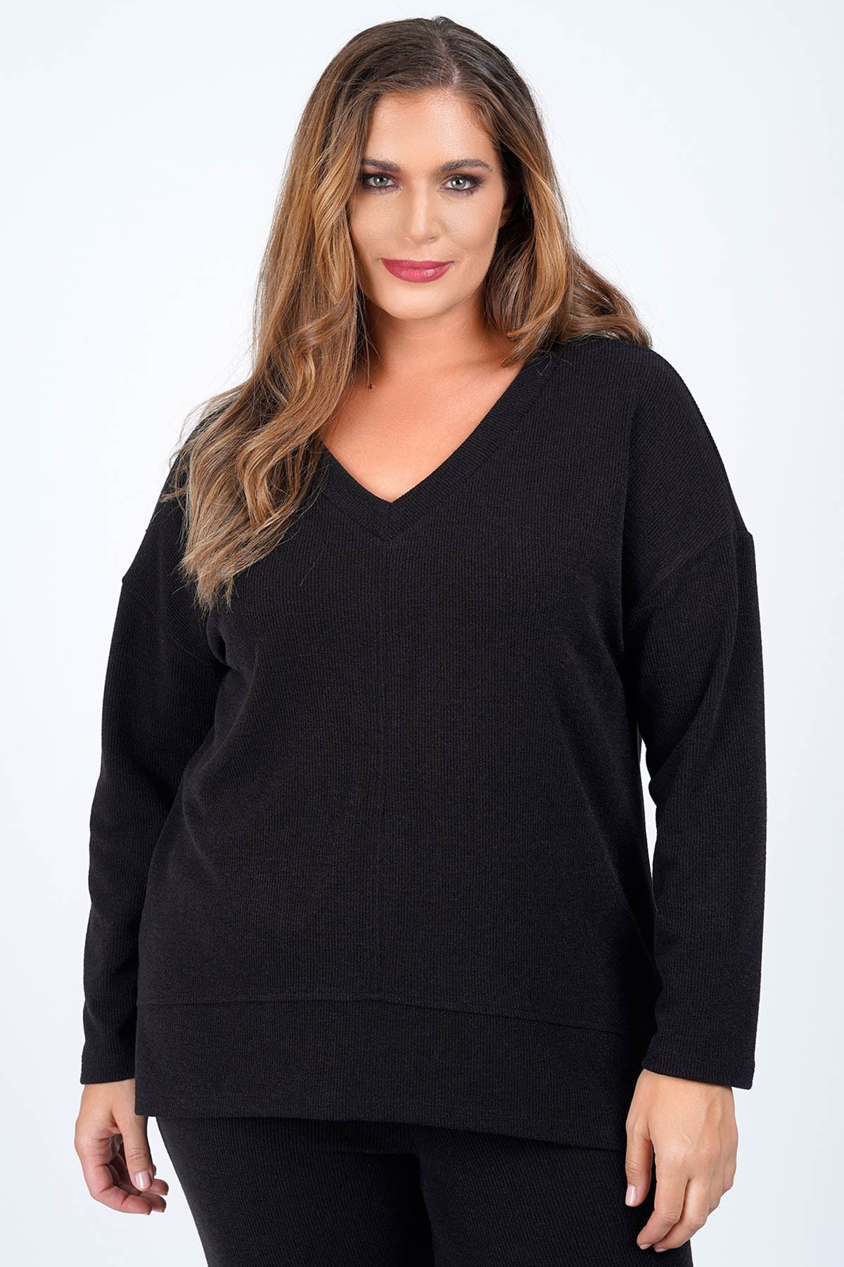 Ένα απαραίτητο κομμάτι για την γκαρνταρόμπα σας! Αυτή η πλεκτή μπλούζα διαθέτει φαρδιά, άνετη εφαρμογή και κολακευτική V λαιμόκοψη. Η διακριτική, ριπ ανάγλυφη πλέξη χαρίζει βάθος και υφή, ενώ η μακρύτερη πλάτη προσφέρει ένα μοντέρνο, χαλαρό τελείωμα. Ιδανική για layering. Συμπληρώστε το σετ με το ασορτί πλεκτό παντελόνι 250412043 για ένα cozy και chic look. Για ένα διαφορετικό outfit, συνδυάστε τη με skinny τζιν ή δερμάτινο κολάν και μακριές μπότες. Προσθέστε ένα εντυπωσιακό κολιέ για να αναδείξετε τη V-λαιμόκοψη. Το μοντέλο έχει ύψος 180 εκ, στήθος 107, μέση 95, περιφέρεια 122 και φοράει το μέγεθος S