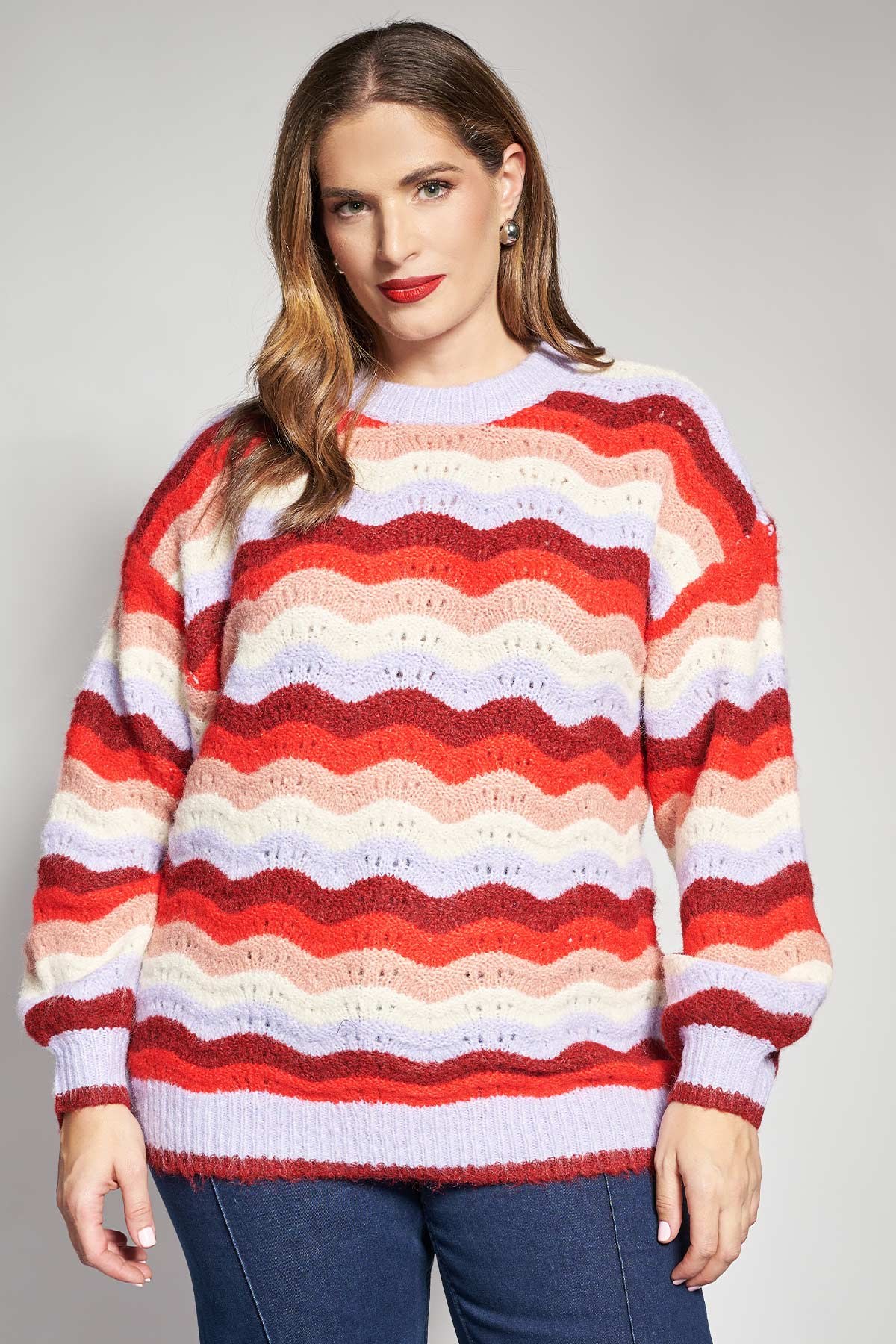 Ένα μαλακό και χνουδωτό πουλόβερ με στρογγυλή λαιμόκοψη και χαλαρή, άνετη εφαρμογή. Η πλέξη του διαθέτει ένα έντονο κυματιστό σχέδιο με οριζόντιες ρίγες, προσδίδοντας δυναμισμό και παιχνιδιάρικη διάθεση. Τα μανίκια είναι φουσκωτά και καταλήγουν σε φαρδύ ριπ τελείωμα, τονίζοντας τον όγκο του. Ένα statement κομμάτι ιδανικό για να δώσει ένταση στα χειμερινά σας σύνολα. Για μια εμφάνιση με casual αισθητική, συνδυάστε το πουλόβερ με ίσια τζιν παντελόνια ή παντελόνι τύπου mom fit. Φορέστε λευκά αθλητικά παπούτσια ή μποτάκια τύπου Chelsea. Ολοκληρώστε με ένα μονόχρωμο, μακρύ παλτό με χρώμα αν θέλετε να δώσετε ακόμη περισσότερη ζωντάνια στο outfit σας.