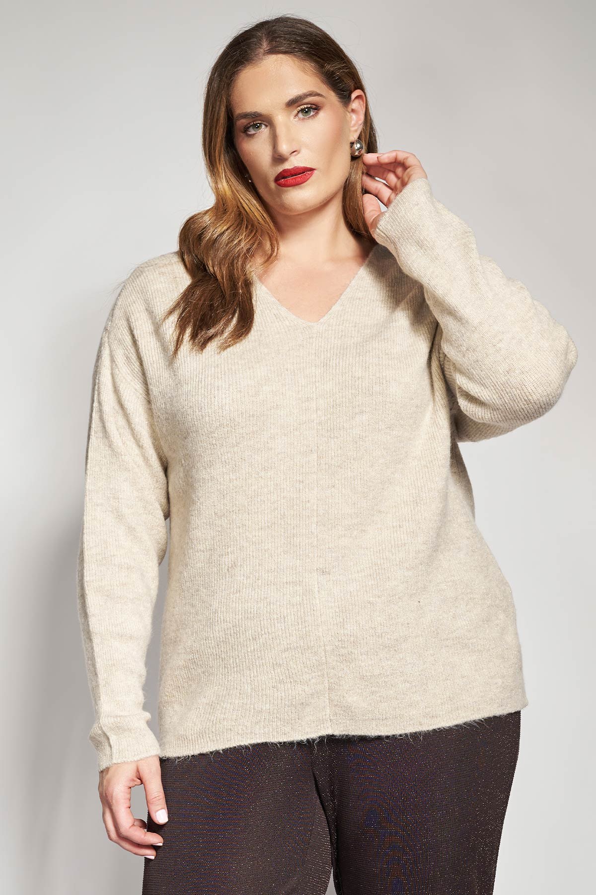 Απαλό και άνετο πλεκτό πουλόβερ με V ντεκολτέ και χαλαρή γραμμή. Η χνουδωτή υφή του και η lurex ίνα του υφάσματος προσφέρουν ζεστασιά και μια αίσθηση πολυτέλειας, καθιστώντας το ιδανικό για τις κρύες μέρες και τις πιο χαλαρές εξόδους. Φορέστε το με ένα παντελόνι κοτλέ σε ίσια γραμμή, ένα ζευγάρι loafers και ένα παλτό με όρθιο γιακά για ένα κομψό και cozy καθημερινό σύνολο. Εναλλακτικά, συνδυάστε το με ένα παντελόνι δερματίνη, kitten heel μπατάκια και ένα ζεστό παλτό για μία casual chic εμφάνιση.