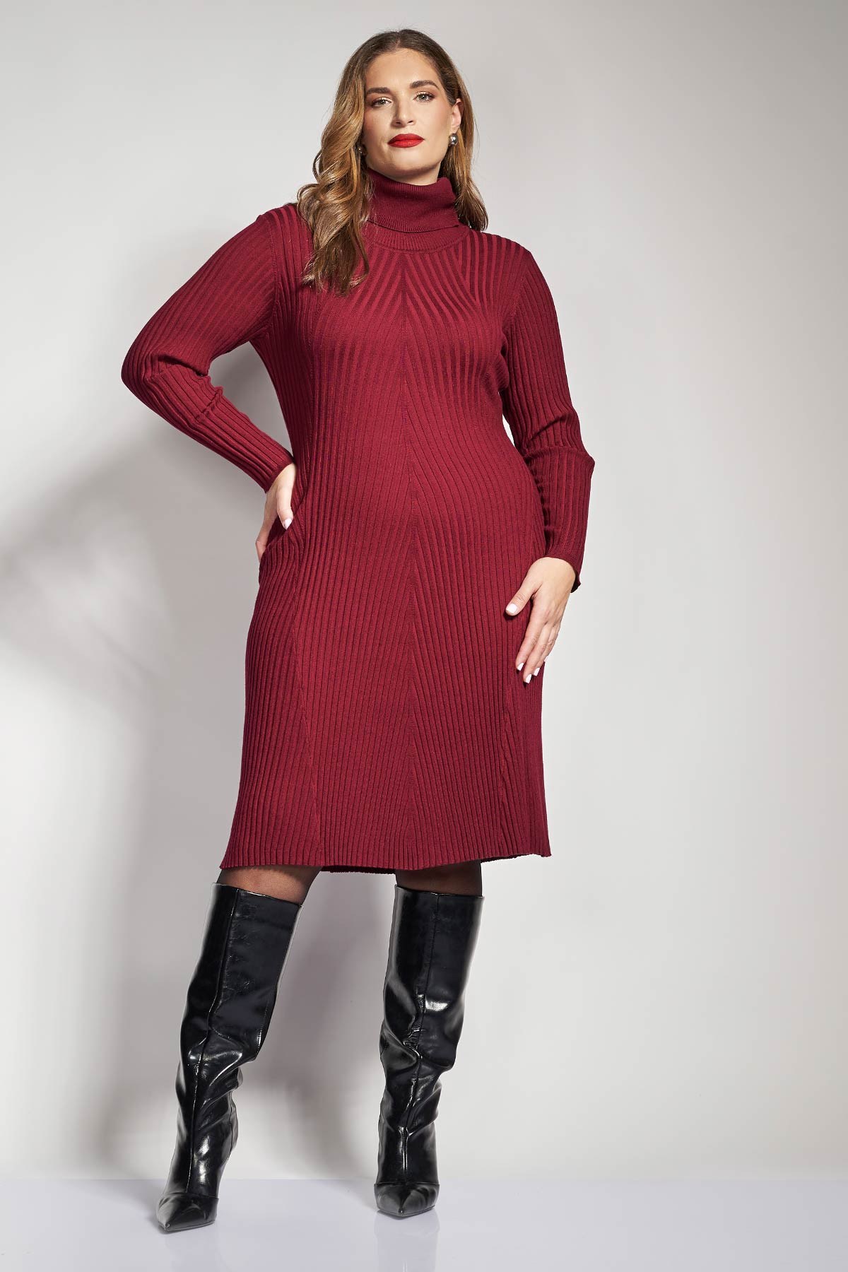 Κομψό πλεκτό φόρεμα ριπ, ιδανικό για ζεστές και εντυπωσιακές εμφανίσεις. Διαθέτει ψηλό ζιβάγκο, μακριά μανίκια και μήκος midi που φτάνει περίπου κάτω από το γόνατο. Το φόρεμα ξεχωρίζει χάρη στην πλέξη του με κάθετες ραβδώσεις που δημιουργούν ένα διαγώνιο μοτίβο στο μπούστο και τονίζουν τη μέση, προσφέροντας μια κολακευτική γραμμή. Συνδυάστε το φόρεμα με αδιαφανές καλσόν και δερμάτινα μποτάκια αστραγάλου με χοντρό τακούνι ή loafers. Προσθέστε ένα μακρύ, tailored παλτό σε μαύρο ή καμηλό χρώμα και μία δομημένη τσάντα χειρός για ένα επαγγελματικό, αλλά άνετο look. Για ένα σύνολο για βραδινή έξοδο, φορέστε το με μαύρες ψηλές μπότες, οι οποίες μπορούν να φτάνουν πάνω από το γόνατο, και ένα κομψό, μάλλινο παλτό. Ολοκληρώστε το σύνολο με χρυσά κοσμήματα και ένα μικρό clutch τσαντάκι για ένα σοφιστικέ αποτέλεσμα. Το μοντέλο έχει ύψος 180 εκ στήθος 107 μέση 95 περιφέρεια 122 και φοράει το μέγεθος S
