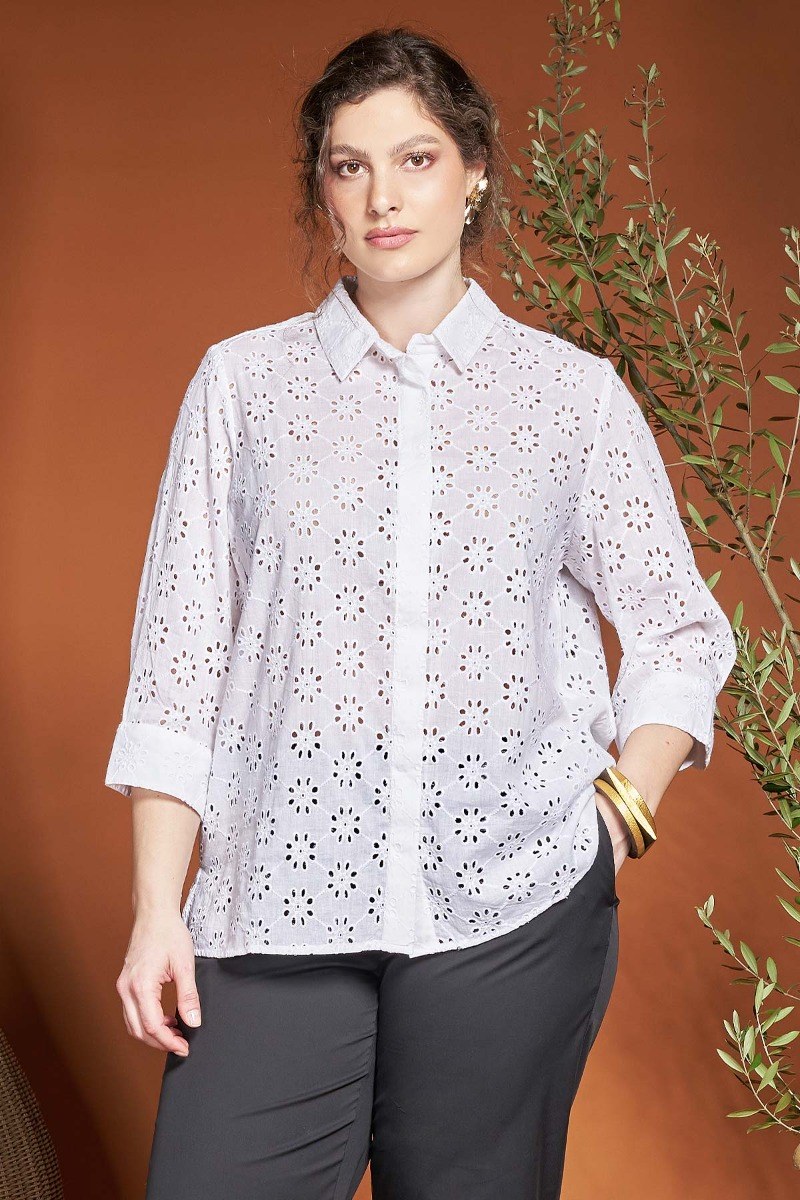Επενδύστε σε ένα κομμάτι που συνδυάζει την κλασική γοητεία με την ανάλαφρη υφή για εμφανίσεις που αποπνέουν φρεσκάδα και κομψότητα. Είναι κατασκευασμένο από σταθερό βαμβακερό ύφασμα με περίτεχνο διάτρητο φλοράλ σχέδιο μπροντερί, σε άνετη, ίσια γραμμή που κολακεύει κάθε σιλουέτα. Διαθέτει κλασικό γιακά, κλείσιμο με κουμπιά μπροστά, μανίκια τριών τετάρτων με μανσέτες και κανονικό μήκος με αέρινη εφαρμογή. Για ένα casual look, συνδυάστε το με ένα τζιν παντελόνι και αθλητικά, ενώ για το γραφείο ταιριάξτε το με μια υφασμάτινη παντελόνα και loafers. Μπορείτε επίσης να δημιουργήσετε ένα casual chic σύνολο φορώντας το ανοιχτό πάνω από ένα top με τιράντες και εντυπωσιακά σκουλαρίκια. Το μοντέλο έχει ύψος 180 εκ στήθος 107 μέση 95 περιφέρεια 122 και φοράει το μέγεθος S