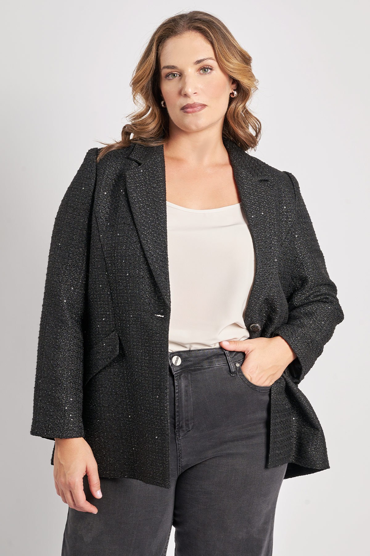 Σακάκι με μονό κούμπωμα. Μπουκέ ύφανση και λεπτομέρειες lurex και παγιέτα. Γυριστό πέτο και μακριά μανίκια. Τριπλό κουμπί στην μανσέτα. Το μοντέλο έχει ύψος 180 εκ, στήθος 107, μέση 95, περιφέρεια 122 και φοράει το μέγεθος S