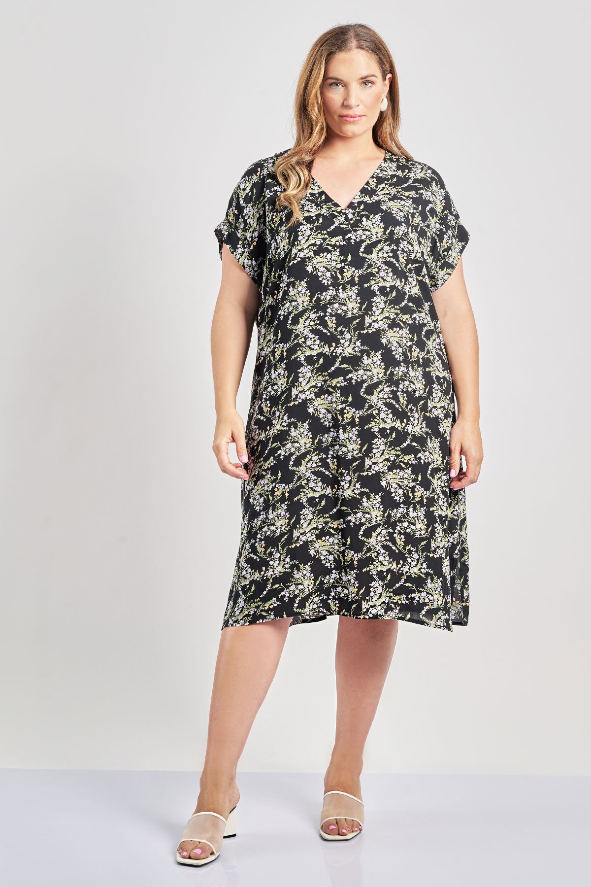 Φόρεμα μίντι από εμπριμέ βισκόζη. Σε ίσια γραμμή, με V λαιμόκοψη και ζαπονέ κοντά μανίκια με ρεβέρ. Άνετη εφαρμογή. Πλαϊνά ανοίγματα στον ποδόγυρο. Διατίθεται σε διαφορετικά εμπριμέ φλοράλ μοτίβα. Το μοντέλο έχει ύψος 180 εκ, στήθος 107, μέση 95, περιφέρεια 122 και φοράει το μέγεθος S