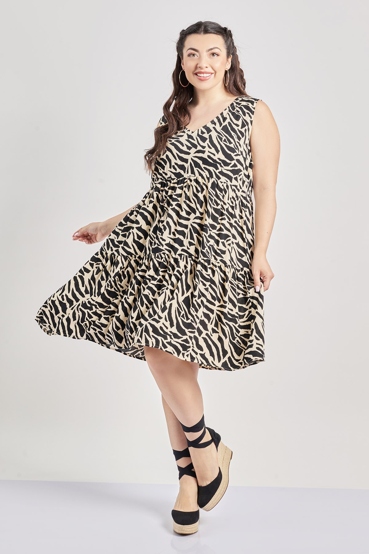 Φόρεμα μίντι, αμάνικο με V λαιμόκοψη. Σε εμπριμέ βιέλα βισκόζης και abstract animal print μοτίβο. Αμπίρ γραμμή με κλος τελείωμα με βολάν. Ελαφρύ και δροσερό. Το μοντέλο έχει ύψος 172 εκ, στήθος 108, μέση 94, περιφέρεια 111 και φοράει το μέγεθος S.