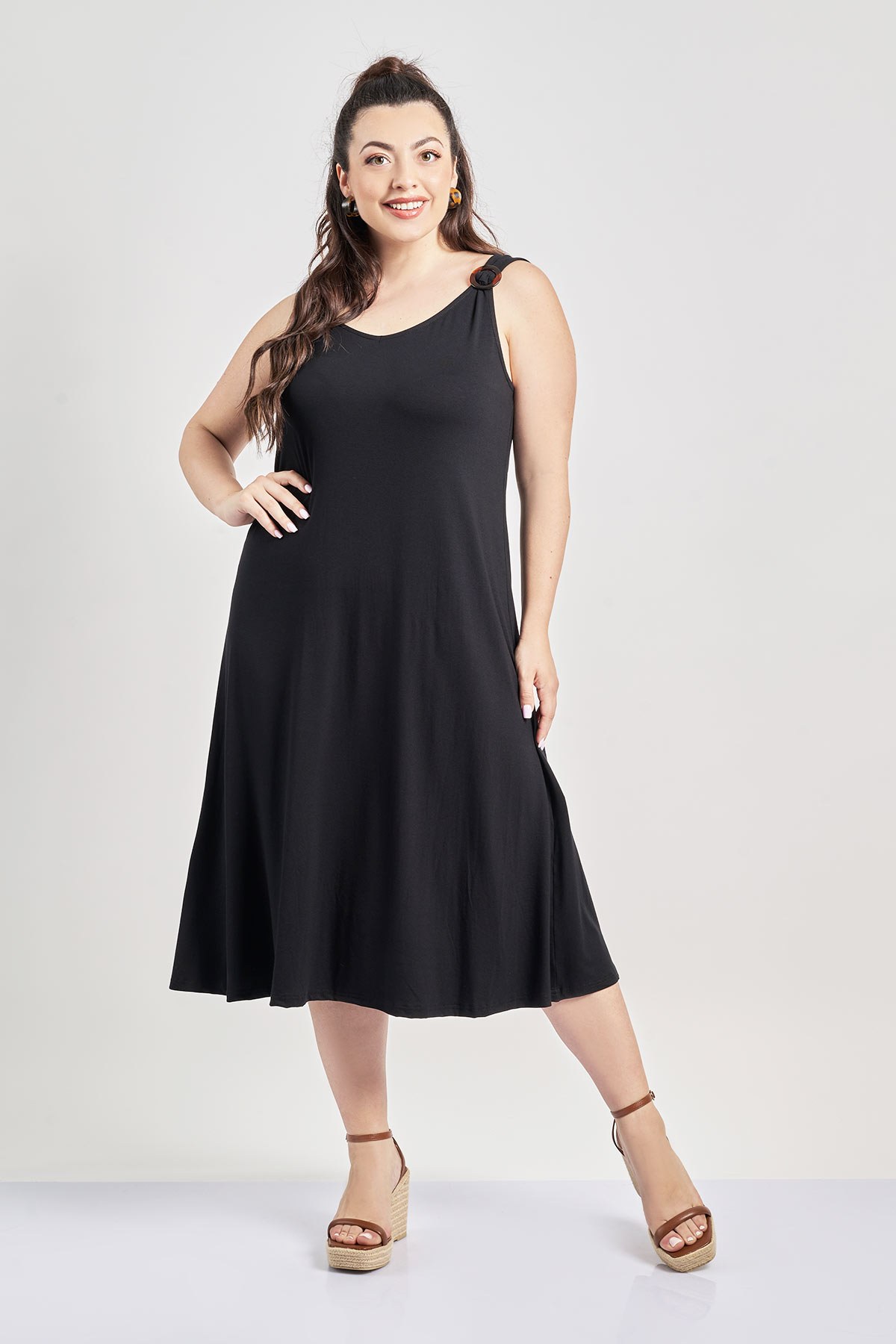 Φόρεμα μίντι από ελαστικό ζέρσεϊ ύφασμα βισκόζης. Αμάνικο με χονδρές τιράντες. Φούστα σε κλος γραμμή. Διακοσμητικές στρογγυλές αγκράφες ταρταρούγας στις τιράντες. Το μοντέλο έχει ύψος 172 εκ, στήθος 108, μέση 94, περιφέρεια 111 και φοράει το μέγεθος S.