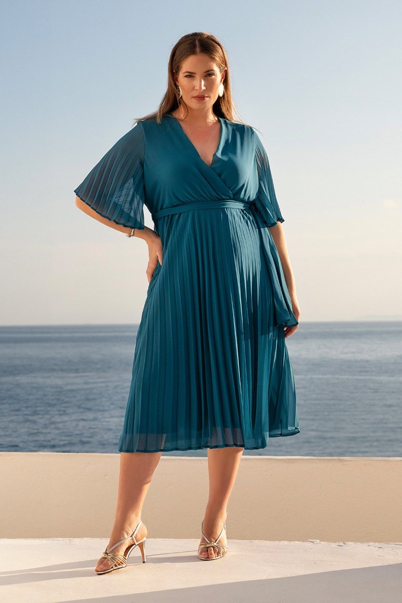 Midi φόρεμα πλισέ από σιφόν. Κρουαζέ μπούστο. Ζώνη μέσης ίδιας ύφανσης. Κοντά ημιδιάφανα μανίκια πλισέ. Φοδραρισμένο στο κυρίως μέρος. Το μοντέλο έχει ύψος 177εκ, στήθος 110, μέση 85, περιφέρεια 115 και φοράει μέγεθος S