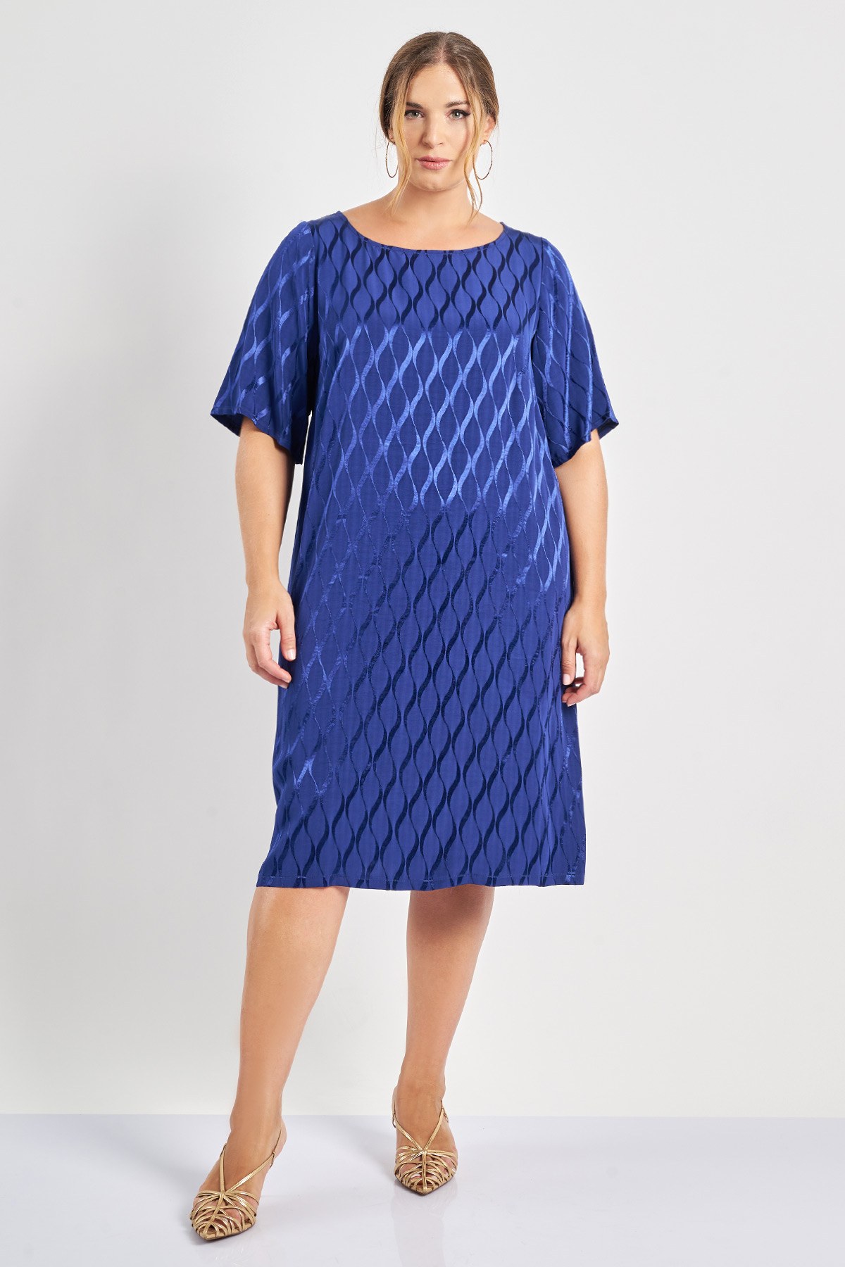 Μίντι φόρεμα σε γεωμετρικό εμπριμέ με σατινέ λεπτομέρειες. Από σύμμεικτο ρεγιόν και βισκόζη. Λαιμόκοψη χαμόγελο και κοντά μανίκια. Το μοντέλο έχει ύψος 180 εκ, στήθος 107, μέση 95, περιφέρεια 122 και φοράει το μέγεθος S